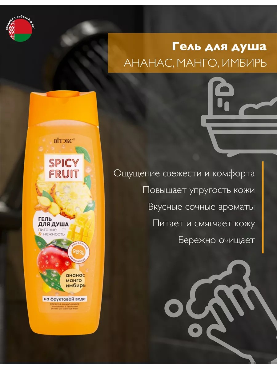 SPICY FRUIT Body Shower Gel Pineapple-Mango-Ginger Belita-Vitex, infused with fruit water, combines gentle cleansing with rich, nourishing care for the skin of your body, hands, and feet. Containing 98% natural ingredients, this shower gel cleanses, gently caresses, and moisturizes throughout the day. Skin becomes firm, toned, radiant, and silky smooth. This shower and bath product is formulated with ginger root infusion, fresh pineapple juice, and ripe mango juice. This perfumed women's shower gel creates a soft, fragrant lather, moisturizes, imparts an unforgettable fruity scent, and provides long-lasting protection from dryness. Suitable for sensitive skin, this shower gel effectively cleanses and gently treats every area of your body. This nourishing anti-stress shower gel is free of silicones, parabens, and mineral oils. This unisex shower gel is ideal for daily use. This men's shower gel will give you a boost of energy and vitality all day long! This gel for the whole family contains only the best ingredients to keep your skin healthy and soft. Belita-Vitex cream-gel makes a wonderful gift for your family and friends for New Year's, birthdays, March 8th, Christmas, and more. Vitex professional body care cosmetics have no age restrictions and are perfect as gifts for mom, dad, grandparents, grandsons, and all relatives and friends.