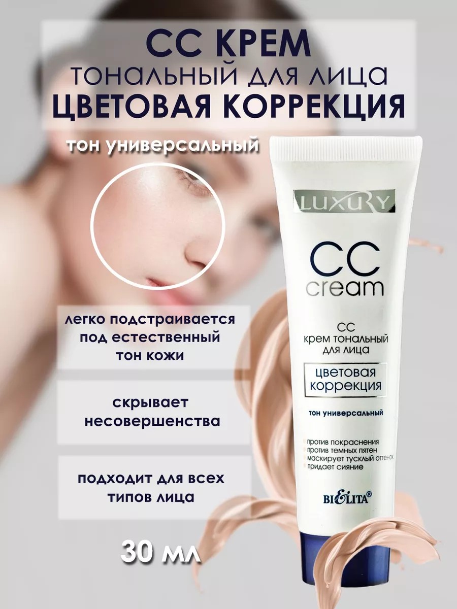СС Крем тональный для лица Цветовая коррекция LUXURY тон универсальный от Белита обеспечивает идеальное покрытие за счет высокой концентрации оптических пигментов, создает безупречный тон и скрывает несовершенства кожи: красные и темные пятна, тусклый цвет лица. Легко подстраивается под естественный тон кожи. Подходит для всех типов лица. Тон универсальный. Применение: нанесите крем на чистую кожу лица, равномерно распределите.
