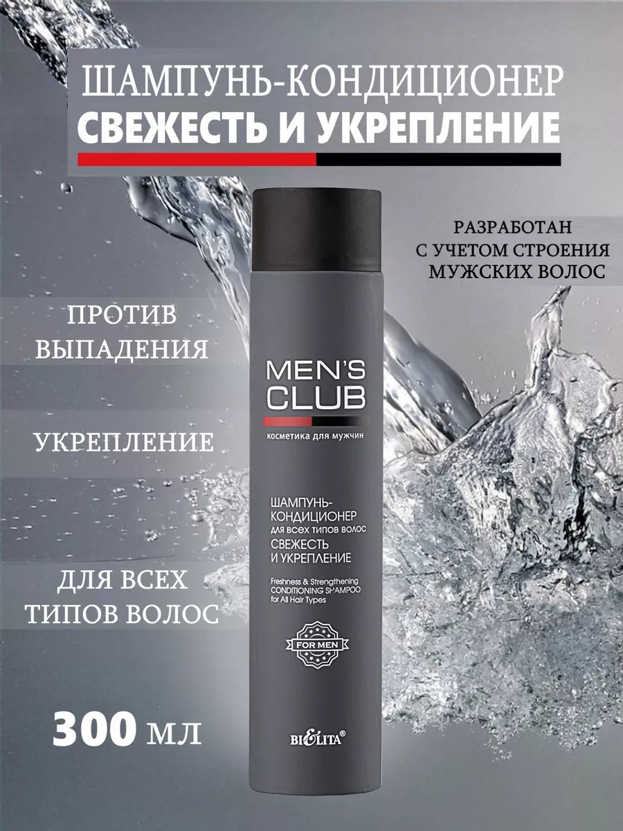 Шампунь-кондиционер для всех типов волос Свежесть и укрепление для мужчин от Белита бережно очищает волосы и кожу головы, не пересушивая их. Придает волосам блеск и гладкость, укрепляет, делает их послушными.