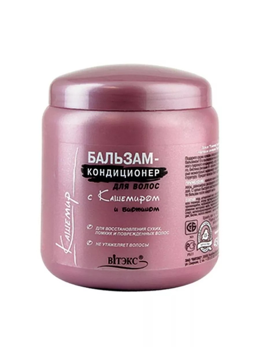 Бальзам - кондиционер для волос Белита - Витекс С кашемиром и биотином, для восстановления, 450 мл. В ассортименте популярной белорусской торговой марки "Витэкс" можно найти косметику для волос любого типа. Большой выбор продукции для оздоровления поврежденных, ломких и истощенных волос порадует женщин. Уникальное средство "Бальзам - кондиционер для волос" в своем составе содержит протеины кашемира и биотина, которые сделают каждый волосок ровным, обогащая и защищая. Натуральные и искусственно выведенные компоненты бальзама проникают в структуру волос, наполняя их питательными минералами при этом не утяжеляя и не делая их жирными. С таким бальзамом ваши локоны будут послушными и блестящими, а расчесывание станет легким, быстрым и приятным. Бальзам - кондиционер порадует вас приятным, оригинальным ароматом. Содержит кашемир, воск пчелиный, гуаровый кондиционер, масло силиконовое и биотин (витамин Н, коэнзим R). Моментально выравнивает структуру волос. Насыщает их силой. Придает упругость. Бальзам - кондиционер незаменим для ухода за сухими, ломкими и поврежденными волосами. Срок годности: 24; Состав: Вода, цетеариловый спирт, хлорид цетримония, хлорид бегентримония, воск пчелиный синтетический, парфюмерная композиция, хлорид гидроксипропилтримония гуара, диметикон, гидролизованный кератин, биотин, молочная кислота, ЭДТА динатрия, метилпарабен, бензиловый спирт, метилхлоризотиазолинон, метилизотиазолинон, глицерин, ПЭГ - 40 гидрогенизированное касторовое масло, пропилпарабен, гексилциннамаль; Объем: 450; Тип волос: Поврежденные; Эффект: Защита от повреждений; Способ применения средства: После мытья волос шампунем слегка отожмите их от лишней влаги, затем нанесите небольшое количество бальзама по всей длине волос, избегая корней. Оставьте бальзам на волосах на 2 - 5 минут (или согласно инструкции на упаковке), после чего тщательно смойте тёплой водой. ;