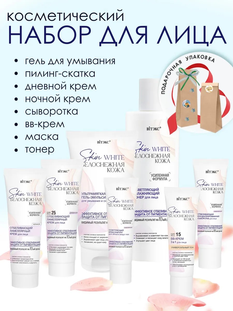 Косметический набор для отбеливания лица Skin White включает 9 средств, которые подходят для кожи любого типа, в том числе чувствительной, склонной к куперозу, раздражениям и покраснениям: