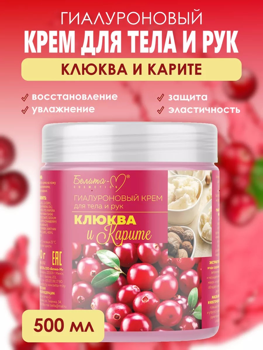 | Комплектация | Крем для тела и рук гиалуроновый Клюква и карите 500 гр |