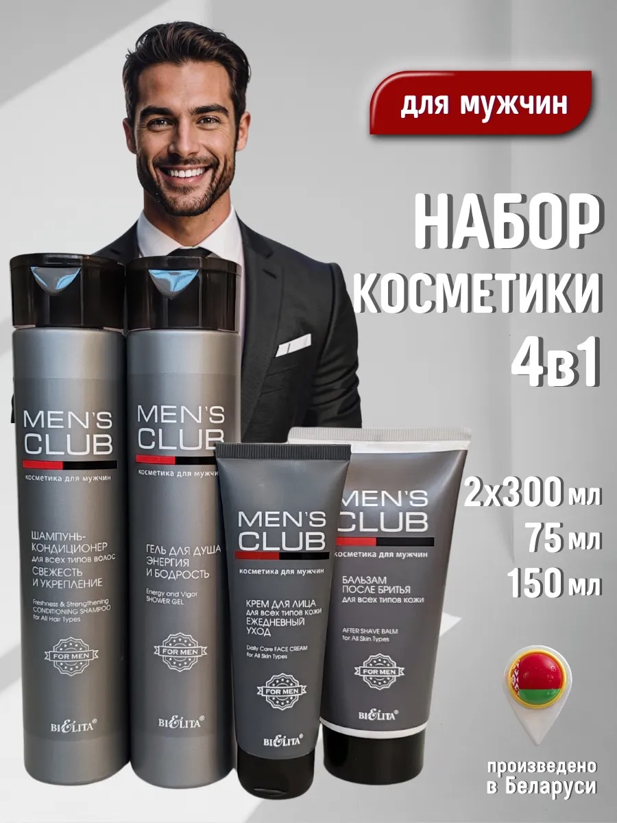 Косметический набор Men’s club включает 4 компонента: шампунь кондиционер 300 мл., гель для душа Энергия и бодрость 300 мл., бальзам после бритья 150 мл., кремдля лица для всех типов кожи 75 мл.