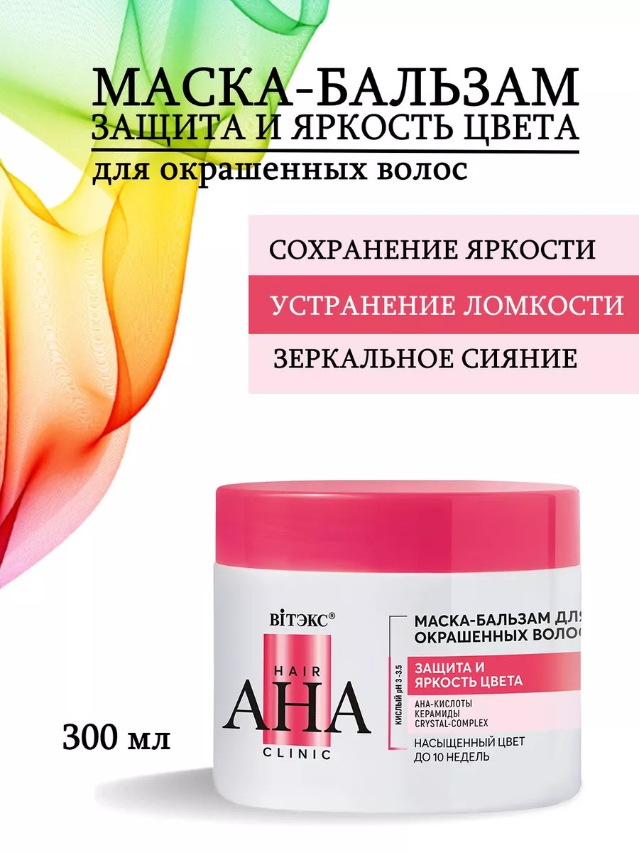 Hair AHA Clinic МАСКА-БАЛЬЗАМ ДЛЯ ОКРАШЕННЫХ ВОЛОС ЗАЩИТА и ЯРКОСТЬ ЦВЕТА от Витекс. Основные результаты после применения бальзама для окрашенных волос с низким рН 3-3.5: сохранение яркости и насыщенности оттенка; запечатывание чешуек кутикулы; защита от вымывания пигмента из кутикулы волоса; восстановление и устранение ломкости; глубокое питание и увлажнение; зеркальное сияние волос.