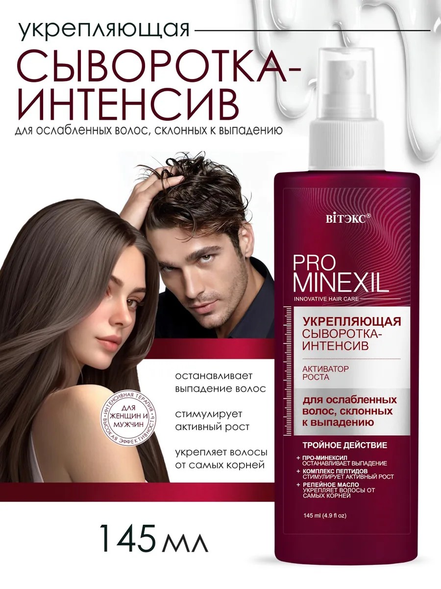 The main active ingredients: pro-minexil (an effective alternative to minoxidil without withdrawal syndrome), a peptide complex, burdock oil, cinnamon and rosemary oils, nicotinamide (vitamin B3), glycine, biotin.