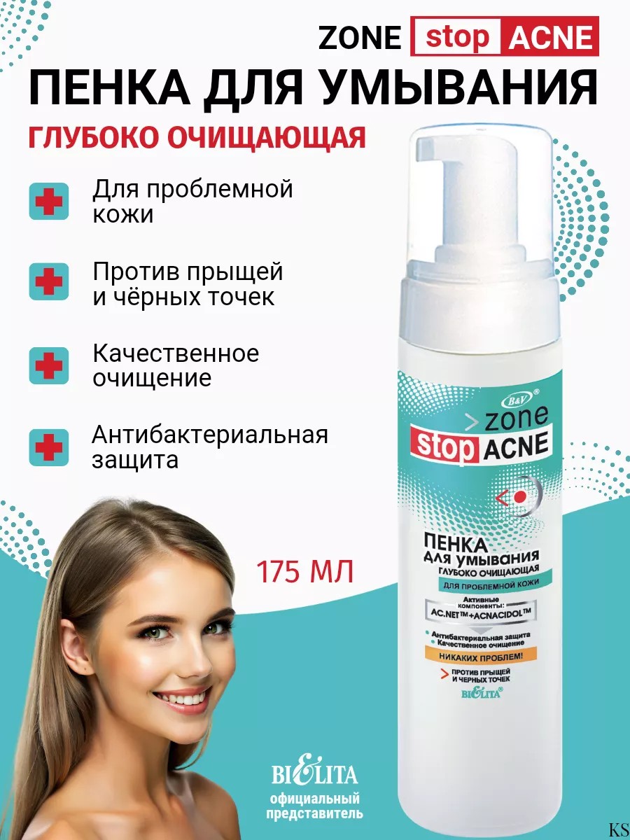 Пенка для умывания глубоко очищающая против прыщей и черных точек от белорусского бренда косметики Белита серия Zone Stop Acne. Эффективная пенка обеспечивает качественное очищение: быстро удаляет загрязнения с поверхности кожи и очищает поры. Активные компоненты обеспечивают антибактериальную защиту и длительную чистоту. Не сушит кожу.