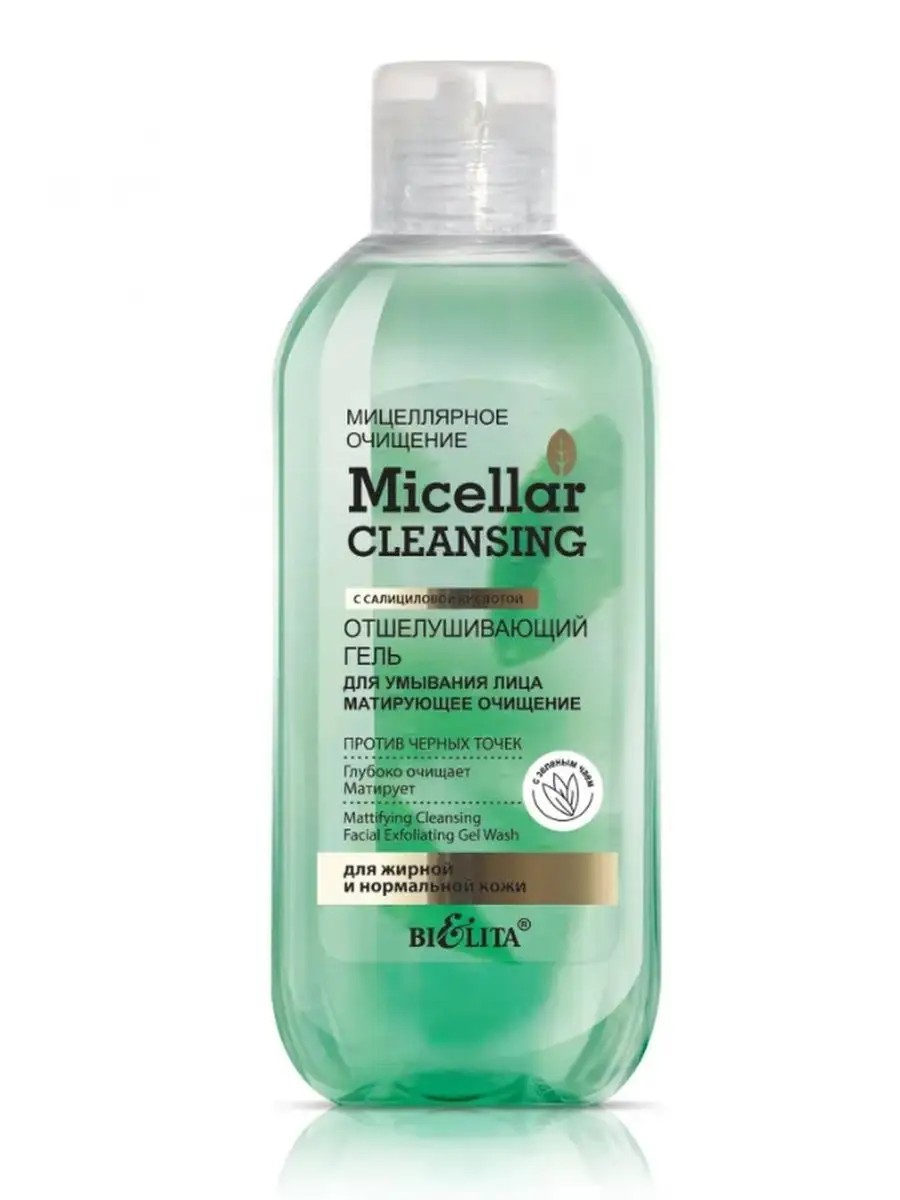 Belita, Гель для умывания Отшелушивающий, "Матирующее Очищение", 200 мл. Отшелушивающий гель для умывания лица Матирующее очищение оказывает очищающий и смягчающий эффект на кожу лица, регулируя секреции сальных желез и создавая анти-раздражающий эффект для кожи. Экстракт зеленого чая и календулы выравнивают тон лица, борются с воспалениями, прекрасно увлажняют и успокаивают кожу. Салициловая кислота оказывает многогранное действие на кожу: эффективно отшелушивает ороговевшие клетки кожи, быстро очищает поры от загрязнений, уменьшает воспаления, обладает омолаживающим действием и отбеливает веснушки и пигментацию.Подходит для всех типов кожи, в особенности для жирной и комбинированной.Способ применениянанесите на влажную кожу, смойте водой.
