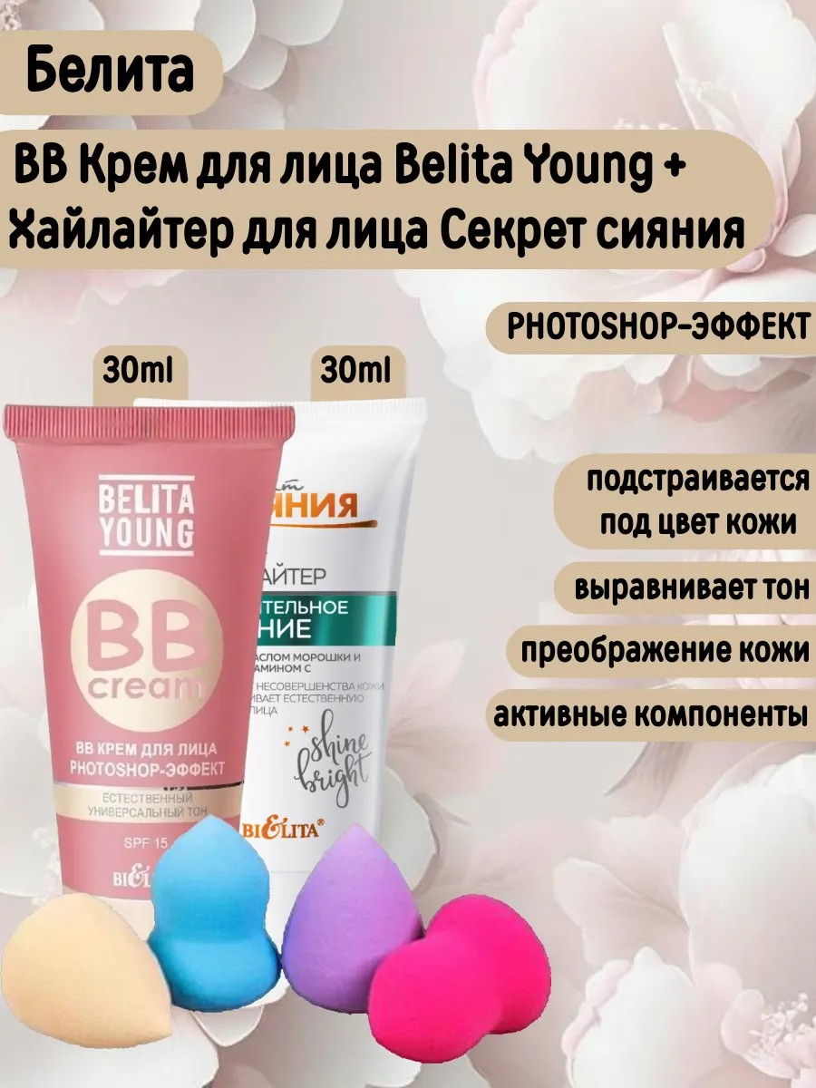| Комплектация | Спонж для макияжа 1шт; Крем-хайлайтер Секрет сияния 1 шт; ВВ Крем для лица Belita Young 1 шт |