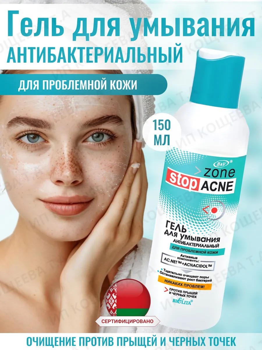 Zone Stop ACNE Antibacterial Cleansing Gel. CLEANSING AGAINST ACNE AND BLACKHEADS. Deeply cleanses pores, leaving skin matte. Antibacterial ingredients inhibit bacterial growth, dry skin without overdrying, and normalize sebum secretion.