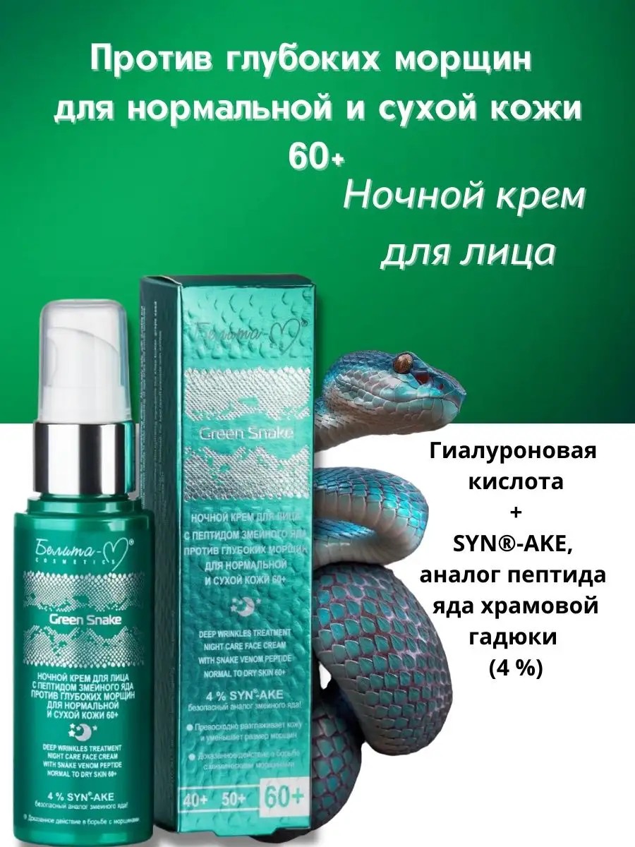 Ночной крем для лица с пептидом змеиного яда против глубоких морщин для нормальной и сухой кожи 60+ GREEN SNAKE Белорусского бренда Белита-М обеспечивает полноценный уход ночью, наполняя ее жизненной энергией, и дарит необыкновенно свежий и отдохнувший вид после пробуждения. Натуральная женская уходовая косметика содержит компоненты: гиалуроновая кислота, эластин, масло ши и оливковое. Антивозрастное средство, расслабляя лицевые мышцы, эффективно разглаживает морщинки, способствует укреплению овала лица, придает гладкость и упругость. Оказывает мгновенное и длительное увлажнение. Для наилучшего применения рекомендуем наносить вечером легкими вбивающими движениями, а в зонах выраженности гусиных лапок, носогубных складок, на лбу тщательно помассируйте до полного впитывания. Перед нанесением воспользуйтесь активной лифтинг - сывороткой – это прекрасная альтернатива инъекциям. Подходит для области шеи и декольте. Для максимального эффекта применяйте в комплексе с дневным.