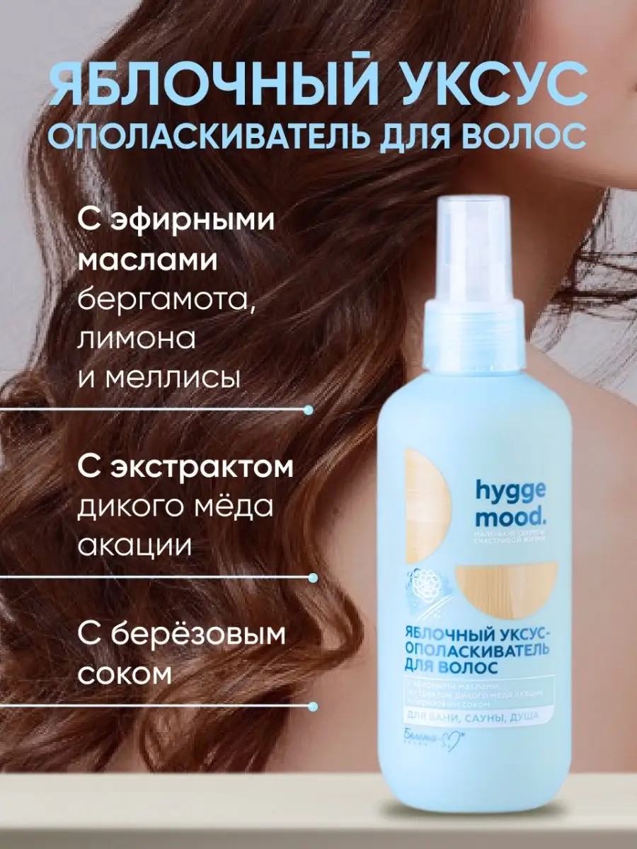 Яблочный уксус-ополаскиватель для волос с эфирными маслами, экстрактом дикого меда акации и березовым соком серии Hygge mood от Белиты придает волосам сияние и делает их послушными. разглаживает кутикулу волос и восстанавливает естественный рн-баланс. жизненная сила и эластичность.Активные компоненты: эфирные масла бергамота, лимона, мелиссы, экстракт дикого меда акации, березовый сок,яблочный уксус. Способ применения: распылите небольшое количество средства на влажные чистые волосы по всей длине (после применения бальзама или маски или как самостоятельное средство), мягко помассируйте, ополосните водой. Можно использовать при каждом мытье волос. Действие:уменьшает пушение, снимает статику и облегчает расчесывание, активизирует кровообращение в коже головы, улучшает рост волос, обладает успокаивающим эффектом.
