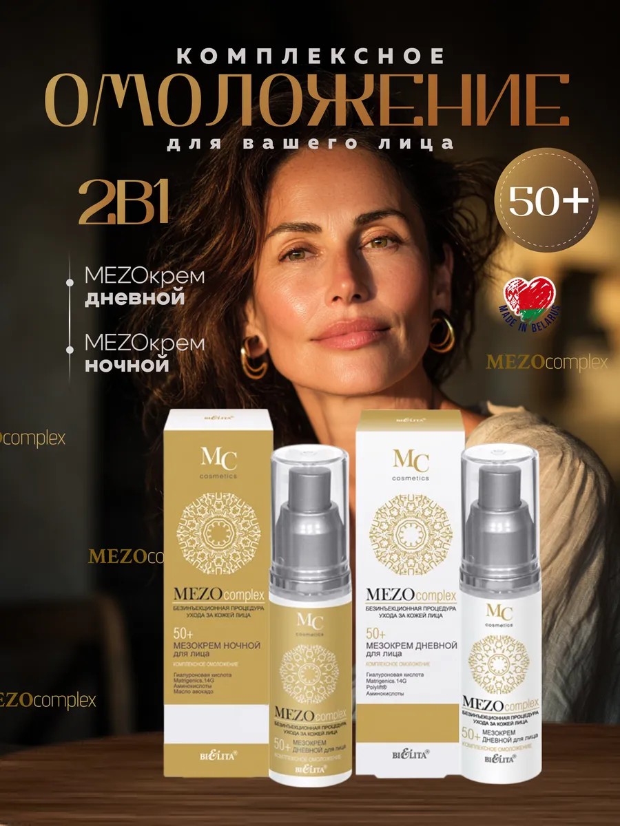 | Package contents | Mezocomplex 50+ day cream "Complex rejuvenation" 50 ml; Mezocomplex 50+ Night Cream "Comprehensive Rejuvenation" 50 ml; Belita; MEZOcomplex; Belarusian cosmetics; anti-aging cream set; face cream Belarus; cream set 50+; Belarusian cosmetics set for the face. |