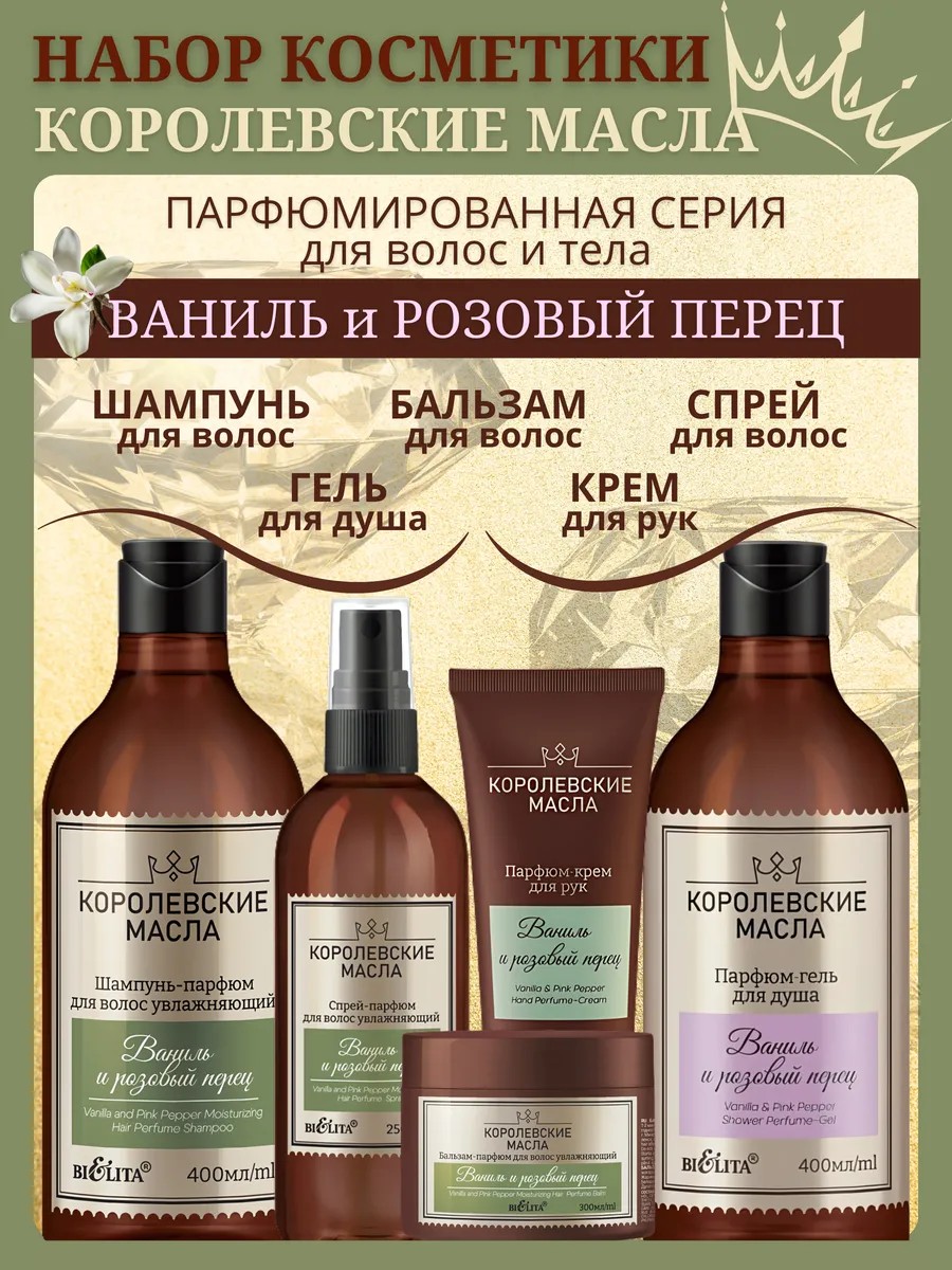 Косметический уходовый набор белорусской косметики от Белиты с королевскими маслами предлагает идеальное сочетание средств по уходу за волосами и телом, обеспечивая настоящий момент роскоши и наслаждения с ароматом "Ваниль и розовый перец".