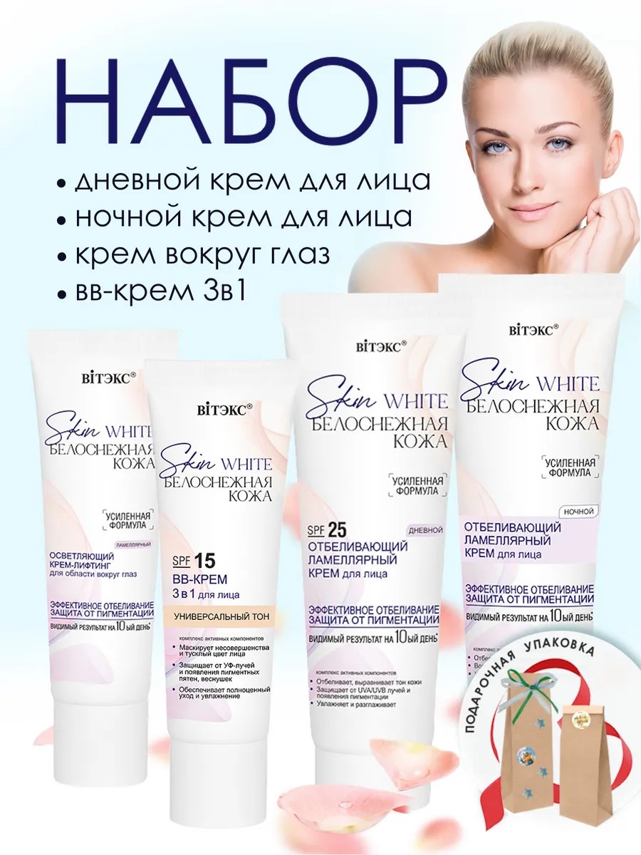 Косметический набор для отбеливания лица Skin White включает 4 средства, которые подходят для кожи любого типа, в том числе чувствительной, склонной к куперозу, раздражениям и покраснениям: