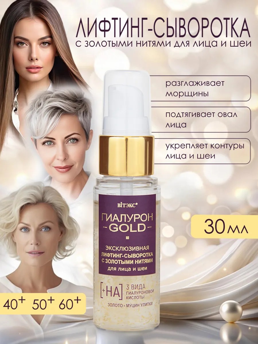 Гиалурон GOLD Эксклюзивная лифтинг-сыворотка с золотыми нитями для лица и шеи – безопасная и по-настоящему действенная альтернатива инъекционным методам омоложения.