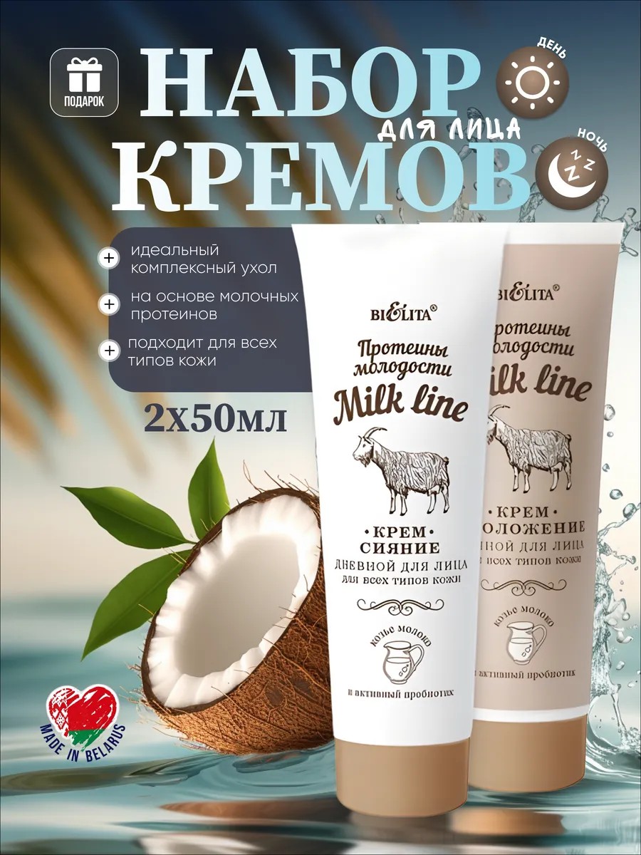 | Package contents | Day face cream (radiance cream); night face cream (rejuvenation cream); set of creams Belarus; Radiance cream; rejuvenation cream; Belita; Belarusian cosmetics; inexpensive cosmetics; MILK LINE; Goat's milk face cream; Belarusian face cream |