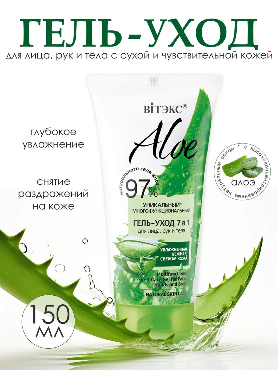 Уникальный многофункциональный гель-уход с необычайно высокой концентрацией натурального высокоактивного сока алоэ вера и других целебных природных компонентов оказывает экстренную помощь коже любого типа, в особенности сухой, уставшей, зрелой и чувствительной: глубоко увлажняет и напитывает сухую кожу, не провоцирует появления нежелательного блеска на коже, склонной к жирности. Успокаивает, снимает раздражения, повышает защитные функции кожи, значительно улучшает ее тонус, упругость и эластичность, делает притягательно гладкой, нежной и шелковистой. Быстро впитывается, не оставляет ощущения липкости.