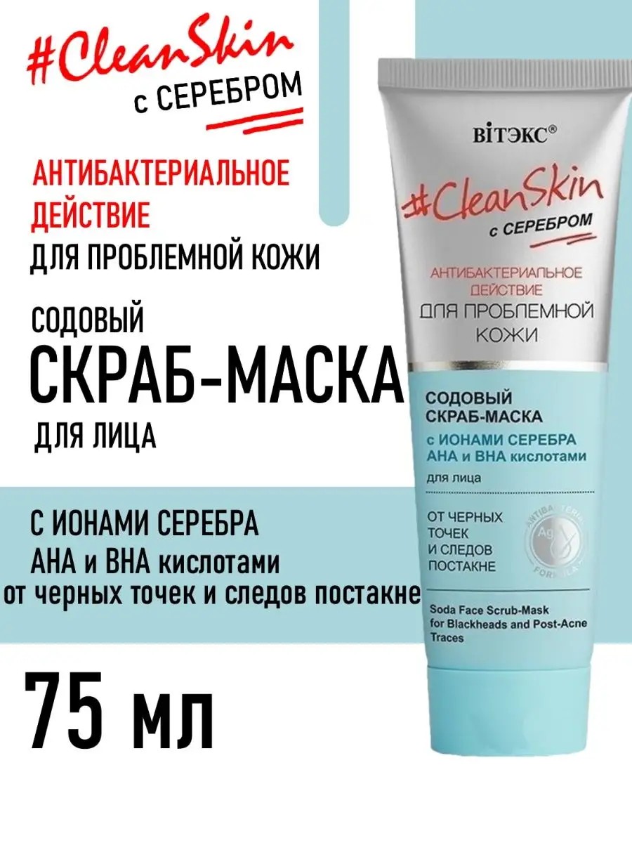 Инновационная формула скраба-маски - это сбалансированная комбинация отшелушивающих микрогранул соды, обновляющих AHA и BHA кислот и антибактериального действия ионов серебра. Ионы серебра обладают антибактериальным и антисептическим действием, уменьшают воспаления и покраснения, предупреждают повторное появление воспалений. Микрогранулы соды в высокой концентрации (не менее 40%) обеспечивают эффективное отшелушивание ороговевших частичек кожи, глубокое очищение пор, оказывают противовоспалительное действие. AHA (гликолевая и молочная кислоты) и BHA (салициловая кислота) стимулируют обновление клеток, нормализуют жирность кожи, уменьшают количество черных точек, способствуют регенерации, выравнивают тон, уменьшают следы постакне. Богатый комплекс растительных экстрактов оказывает противомикробное, противоотечное и антисептическое средство, способствует быстрой регенерации клеток, уменьшает покраснения и нормализует выделения себума.