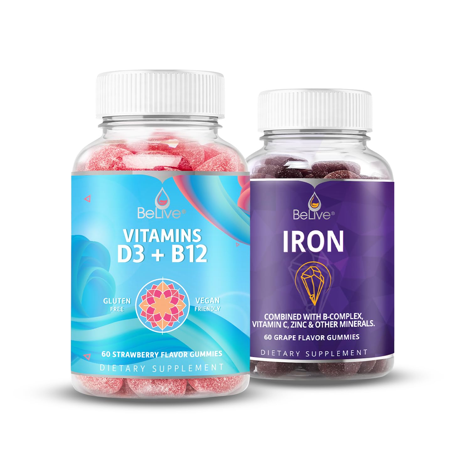 BeLive Iron and Vitamins D3 B12 Bundle for Energy Blood Oxygen Inmune Support and Enhanced Bone and & Muscle Strength
