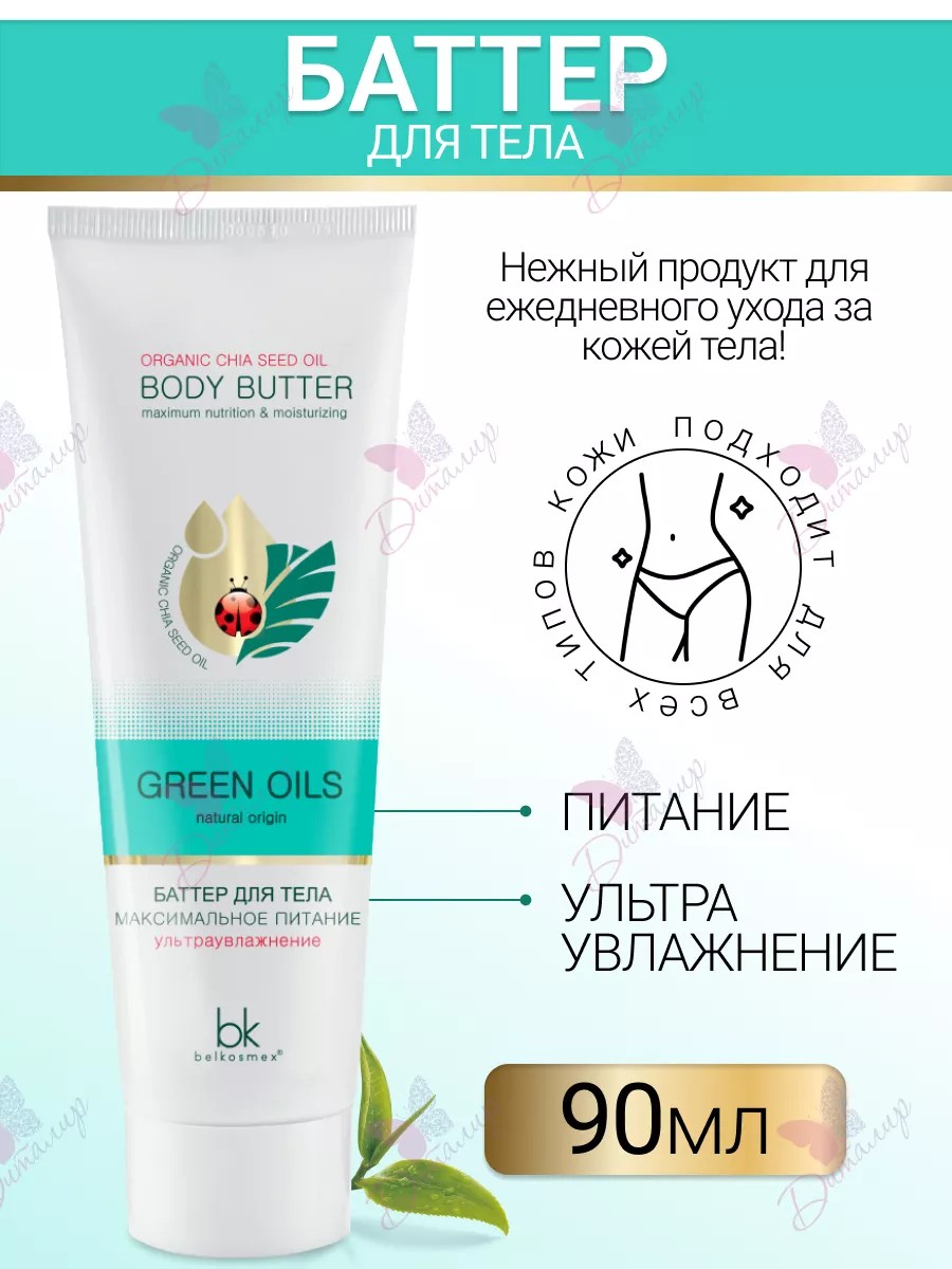 Баттер для тела максимальное питание от Green Oils – это универсальное средство для ухода за кожей, предлагаемое брендом Belkosmex. Этот крем идеально подходит как для дневного, так и для ночного использования, обеспечивая защиту, смягчение и питание кожи. Состав баттера включает в себя натуральные ингредиенты, такие как масло кокоса, масло чиа, масло ши, масло розы мускусной, а также витамин Е, которые способствуют увлажнению и укреплению кожи. Благодаря его универсальности, этот баттер является отличным выбором для ежедневного ухода за телом, оставляя кожу нежной и обладающей приятным ароматом.