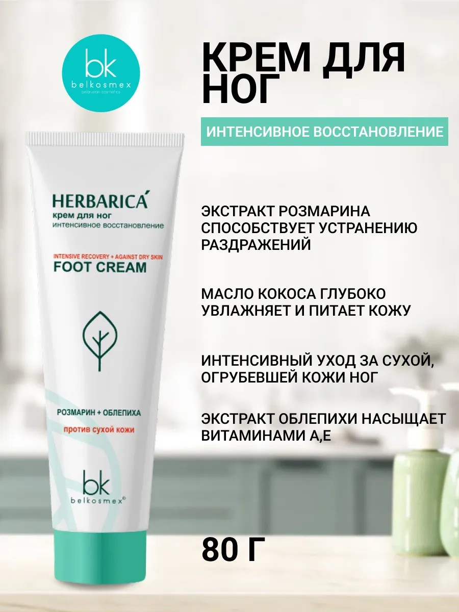Belkosmex представляет крем для ног интенсивное восстановление из линии Herbarica. Этот продукт предназначен для ухода за кожей вокруг глаз, и его основная задача - интенсивное восстановление сухой, огрубевшей и потрескавшейся кожи стоп.