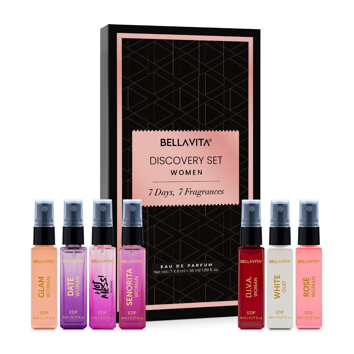 Each perfume stays for up to 8 hours so that you slay all day long!. Explore a range of captivating scents, from floral to fruity, to match every mood. Comes in 8 ml bottles, perfect for on-the-go use and travel. Features 7 unique perfumes, each representing a different day of the week. Discover a new fragrance daily with our 7-perfume Discovery Set for women.