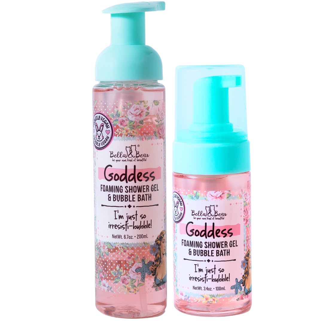 Luxurious Experience Anywhere: Transform your bath time into a pampering retreat with the Goddess body wash and bubble bath. The full-size for at-home relaxation and the mini size for travel ensure that you can enjoy a soothing, fragrant experience wherever you are. Suitable for All Ages: Designed for women, tweens, and teens alike, this product adds a playful touch to anyone's bathing routine, making it suitable for the entire family. Perfect for Gifting: With its charming packaging, this bundle makes for an ideal gift for birthdays, holidays, or simply to brighten someone's day—perfect for any occasion!. Cruelty-Free Vegan: Indulge in a self-care routine that aligns with your values. This body wash and bubble bath are crafted with care, being both cruelty-free and vegan. Versatile 2-in-1 Bundle: Enjoy the best of both worlds with the Goddess 2-in-1 Body Wash Bubble Bath bundle, which includes both a full-size and a mini travel size. Perfect for a refreshing wash or a relaxing bubble bath experience at home or on the go.
