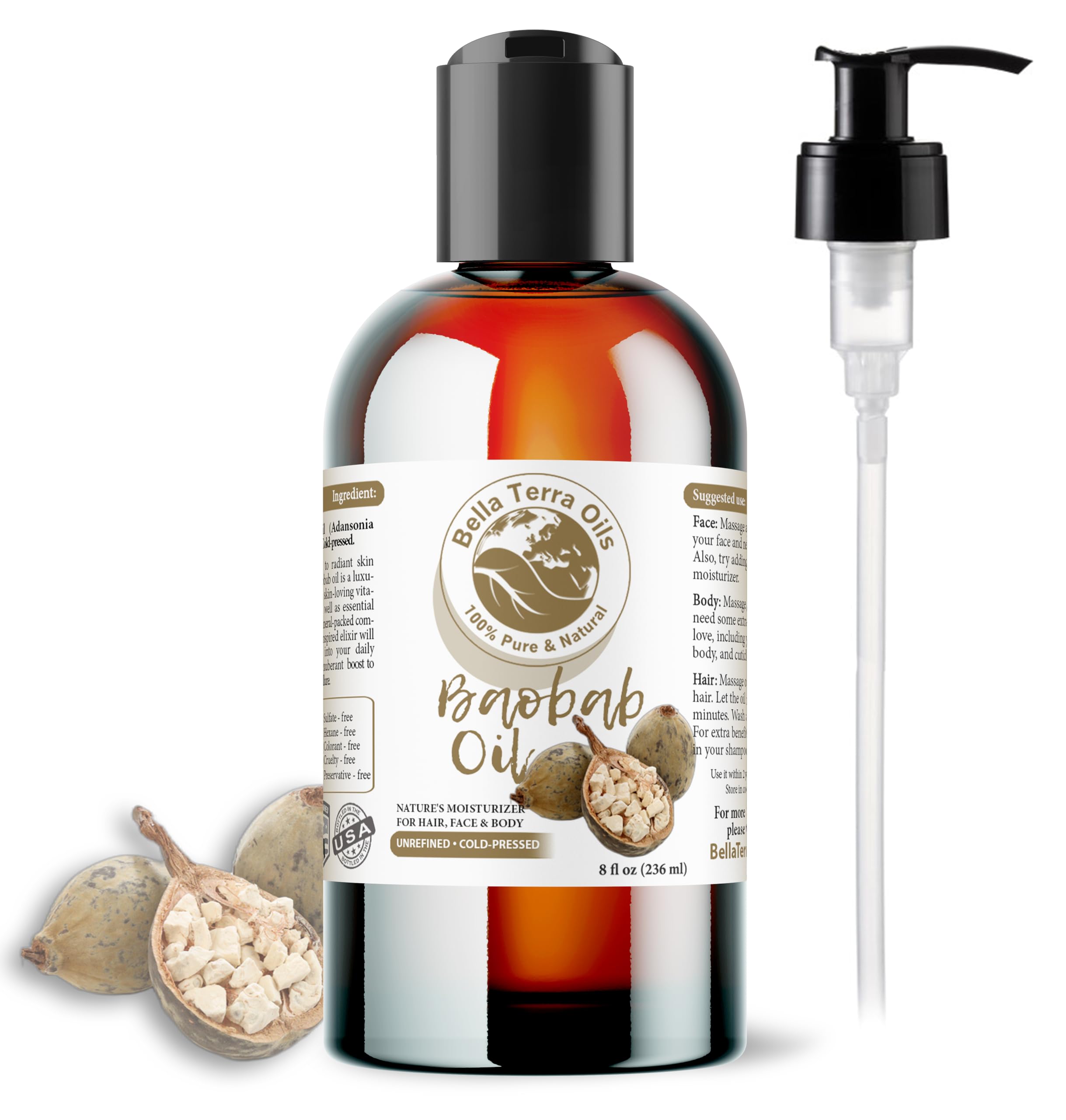 Bella Terra Oils - Baobab Oil 8 oz - Derived from the Majestic Baobab Tree Enriched with Vitamin A & F For a Smooth Plush Skin Experience 8 Fl Oz (Pack of 1)