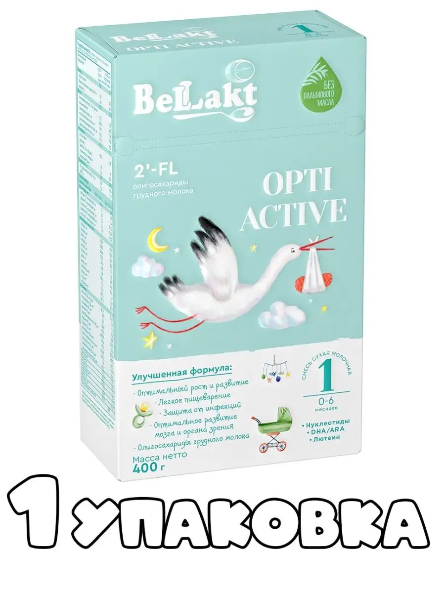 "Bellakt Opti Active" - инновационная линейка детского питания с олигосахаридами грудного молока. По своему составу и функциональным свойствам входящих компонентов оптимально приближена к грудному молоку. Содержит Олигосахариды 2´-FL, Омега-3 и Омега-6 жирные кислоты, оптимальное количество белка, нуклеотиды, лютеин, пребиотик FOS, витамины, макро- и микроэлементы, другие биологически активные вещества для оптимального роста и развития малыша. Не содержит пальмового масла.