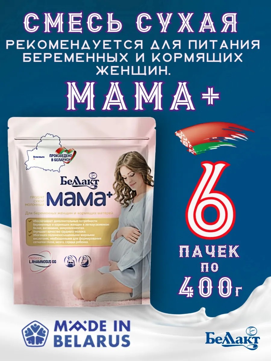 Продукт молочный Беллакт Мама+ для беременных и кормящих женщин 400г Производитель: Волковысское ОАО «Беллакт» 231900, Гродненская обл., г. Волковыск, ул. Октябрьская, 133, Беларусь. Торговая марка: Беллакт Страна производства: Беларусь