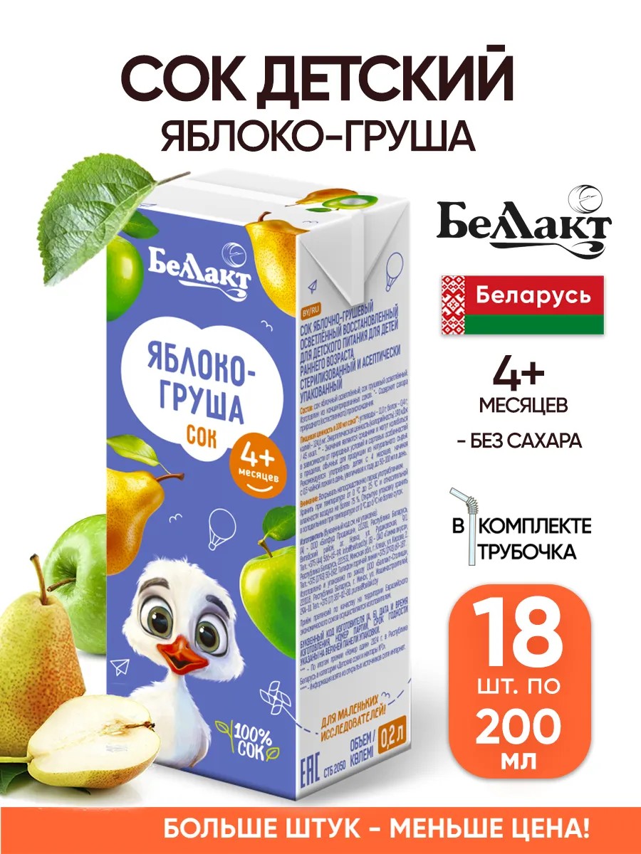 Представляем вам яблочный, грушевый осветленный сок в объеме 0,2 из Беларуси - Беллакт. Продукт без сахара, подходит для начала питания малышей. На заводе белорусского производителя используются международные стандарты и сертификаты качества, товар полностью соответствует всем нормам, предъявляемым к рациону детей.
