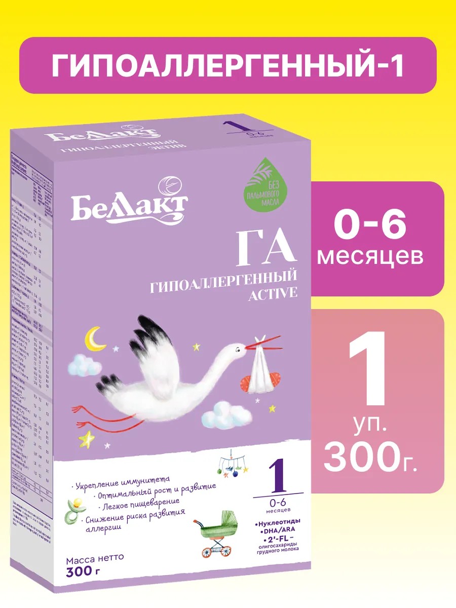 Hypoallergenic Active 1 is an innovative premium baby food from the Belarusian brand Bellakt. It is recommended for feeding healthy children at risk for food allergies from birth to 6 months. Its balanced composition and functional properties are as close as possible to breast milk, effectively serving as a substitute. Its distinctive bitter taste is due to the presence of protein hydrolysate. This product is used for therapeutic purposes and enables babies to fully develop. Oligosaccharides 2'FL, included in its carbohydrate component, promote the development of a diverse, beneficial intestinal microbiota; support the child's immunity, reduce the occurrence of allergic reactions, protect against infections, and improve digestion. This formula is specially adapted for newborns and serves as an additional source of vitamins, macro- and microelements essential for young children, as well as an alternative food for babies who, for various reasons, cannot be breastfed. It's very easy to prepare: just dissolve the dry powder in a certain amount of cooled boiled water and stir thoroughly.