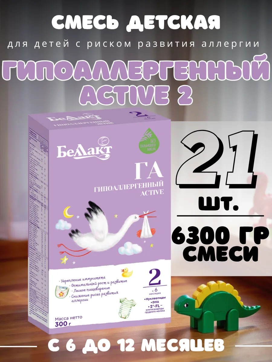 Hypoallergenic Active 2 is an innovative premium baby food from the Belarusian brand Bellakt. It is recommended for feeding healthy children at risk for food allergies from 6 to 12 months. Its balanced composition and functional properties are as close as possible to breast milk, effectively serving as a substitute. Its distinctive bitter taste is due to the presence of protein hydrolysate. This alternative product is used for therapeutic purposes and enables babies to fully develop. Oligosaccharides 2'FL, included in its carbohydrate component, promote the development of a diverse, beneficial intestinal microbiota; support the child's immunity, reduce the occurrence of allergic reactions, protect against infections, and improve digestion. This formula is specially adapted for young children and serves as an additional source of vitamins, macro- and microelements. It is very easy to prepare: simply dilute the dry powder in a certain volume of cooled boiled water and stir thoroughly. Belarusian equivalents of Kabrita, NAN, Nestogen, Nutrilak, Nutrilon, Similac, Malutka, and Neocate formulas. Manufacturer: Volkovysk Open Joint-Stock Company "Bellakt" - Grodno Region, Volkovysk, Oktyabrskaya Street, 133