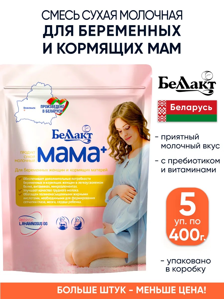 Продукт сухой молочный для питания беременных и кормящих женщин БЕЛЛАКТ МАМА + 400гр. Рекомендуется для питания беременных и кормящих женщин.Продукт содержит:Белок 3,5 г / 100 мл, необходимый для роста плода, плаценты, матки, грудных желез, поддержания лактации;Полиненасыщенные жирные кислоты (омега-3 и омега-6) для формирования иммунитета и органа зрения у ребенка;Кальций для полноценного формирования скелета, зубов, профилактики рахита у ребенка и остеопороза у беременной женщины и кормящей мамы;Пребиотик (инулин), который облегчает пищеварение, стимулирует двигательную активность кишечника, способствует формированию здоровой микрофлоры у матери и малыша;Пробиотик (Lactobacillus rhamnosus GG) способствуют формированию здоровой микрофлоры у матери и малыша, а также снижает риск развития аллергии;Напиток содержит все витамины, макро- и микроэлементы необходимые для нормального обмена веществ в организме матери и ребенка.