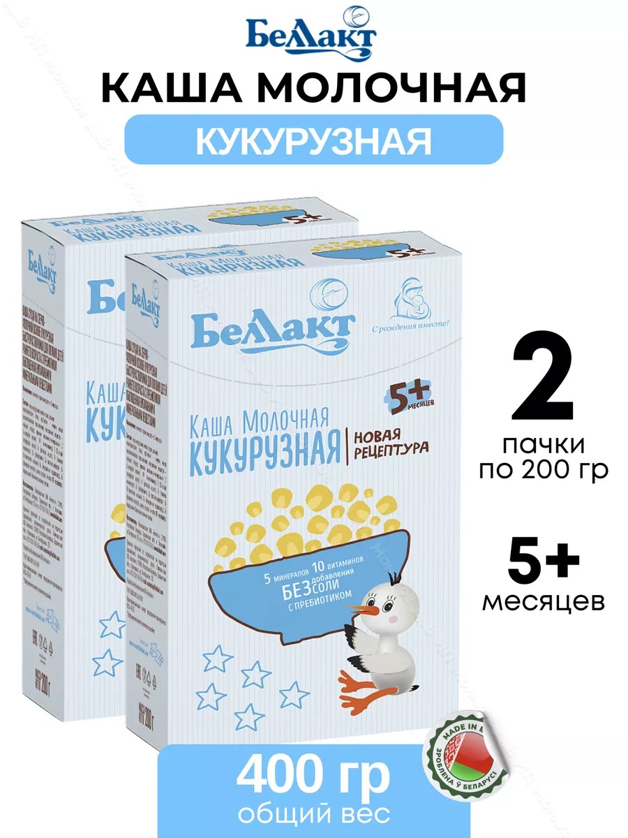 Corn milk porridge is a premium baby food from the flagship Belarusian company Bellakt. It is made using innovative technology and is intended for the first feeding of infants aged 5+ months. It is free of salt and harmful additives and contains the prebiotic inulin, which improves the immune system, positively influences the composition of intestinal bacteria, and effectively stimulates digestion. Grains such as corn are a living source of minerals and microelements, a true treasure trove of fiber, and a source of energy. This dry instant mixture is made exclusively from plant-based ingredients and includes only natural ingredients. It is suitable for a vitamin-rich diet for babies and is prepared simply by mixing it in water, milk, or juice. As a child grows, it is important to receive balanced nutrition on a timely basis for full development, so it is important to try to vary their diet. The manufacturer has made its cereal product as healthy and easily digestible as possible for children under one year old. A rich multivitamin and mineral complex provides the body with all the necessary nutrients (iron, zinc, potassium, vitamins A, C, E, D3, PP, B1, B2, B5, B6, and B9). This porridge can be given to breastfed babies during night and day feedings, and for older children, it can be prepared for breakfast before going to kindergarten.