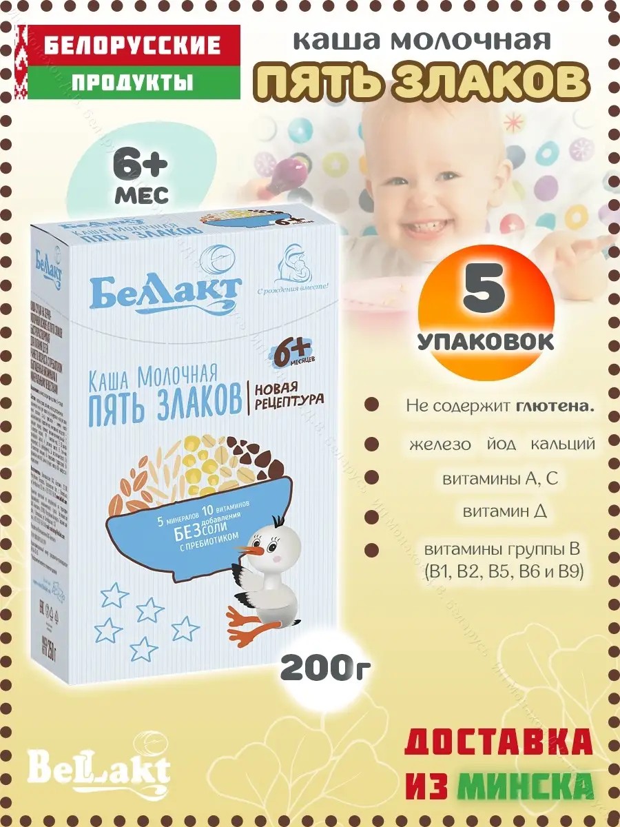 Каша пять злаков от крупнейшей белорусской компании Беллакт - это детское молочное питание класса премиум. Она изготовлена по инновационной рецептуре и предназначена для первого прикорма младенцев с 6+ месяцев. Не содержит соли и вредных добавок. В ней - только натуральные ингредиенты: нормализованное молочко, гречневая кукурузная рисовая пшеничная и овсяная мука; совсем нет красителей и консервантов. Она подходит для мультизлаковой диеты и служит важным поставщиком углеводов для малышей. По мере того, как ребенок подрастает, необходимо разнообразить его рацион, чтобы он своевременно получал сбалансированную еду для полноценного развития. Зерновые культуры - это богатый источник минералов и микроэлементов. Производитель постарался, чтобы его злаковый продукт был максимально полезен и хорошо усваивался грудными детьми. Сухая быстрорастворимая смесь готовится обычным размешиванием в воде, соке либо молоке. Она выполнена исключительно на растительной основе. В ней содержится пребиотик инулин, который улучшает защитную функцию и повышают иммунитет, положительно влияет на состав кишечных бактерий, стимулирует пищеварение и образование жирных кислот. А присутствующий в ней поливитаминный комплекс насыщает организм всеми нужными витаминными и минеральными веществами (РР, А, С, Е, D, В1, В2, В5, В6, В9, кальций, железо, йод, цинк, натрий). Грудничкам ее можно давать во время ночного и дневного кормления, а ребятишкам постарше - готовить на завтрак перед походом в садик.
