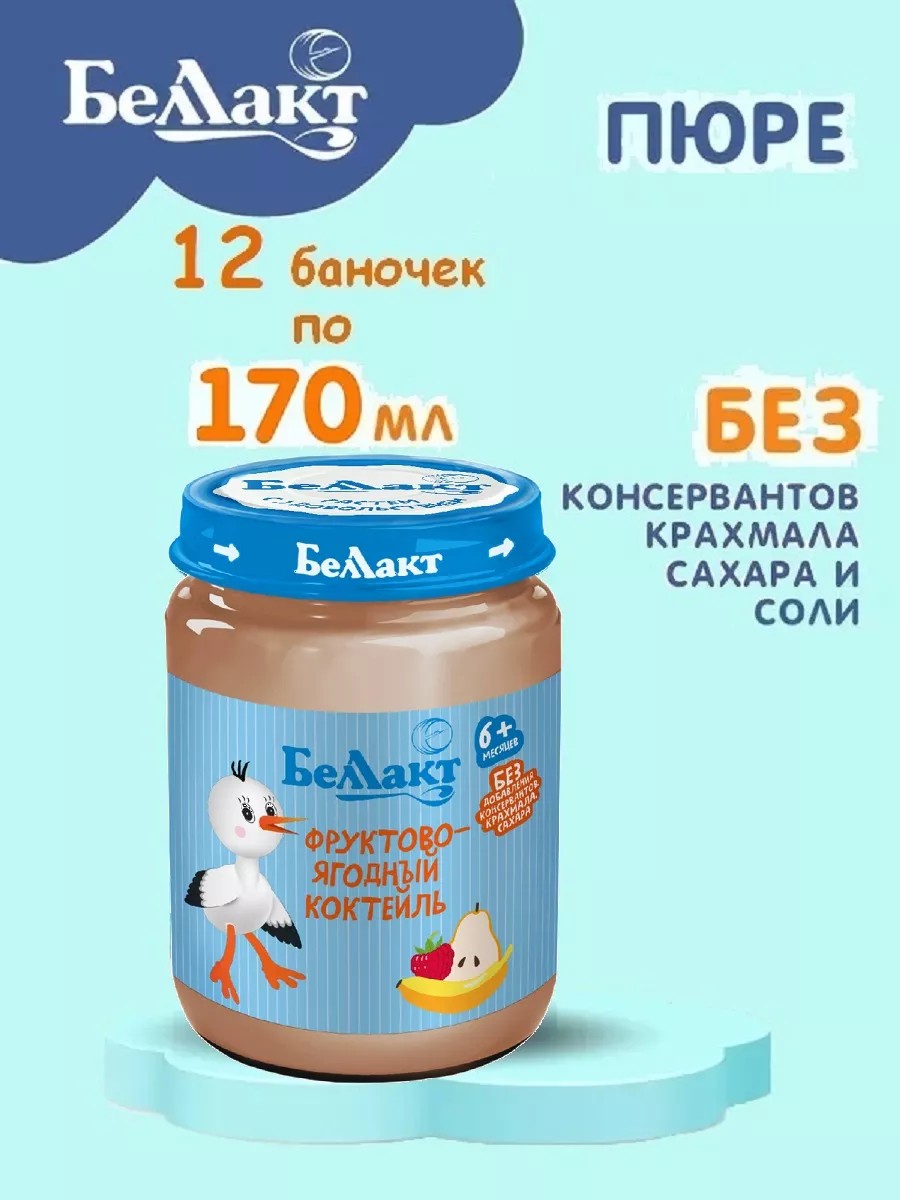Детские пюре фруктовые представлены различными группами без добавления крахмала, сахара, соли, консервантов и других пищевых добавок. Фруктовые пюре Беллакт приготовлены только из 100% фруктов, богатых витаминно-минеральным комплексом. Это вкусное а главное полезное пюре, которое полезно детям любого возраста! Фруктовое пюре обеспечивает организм ребенка пищевыми волокнами, разнообразными углеводами и минеральными веществами. Пюре овощной салатик рекомендуется детям с 5 месяцев, начиная с 0,5 чайной ложки в день, увеличивая к году до 100г в день. До вскрытия банки хранить при температуре от - до 25 градусов Цельсия и относительной влажности воздуха не более 75%. После вскрытия банки хранить при температуре от 0 до 6 градусов Цельсия не более суток. Вскрывать непосредственно перед употреблением. При отсутствии хлопка в момент вскрытия в пищу не употреблять. Перед употреблением взбалтывать!