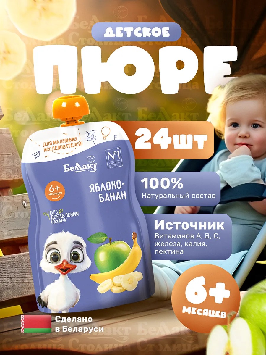 Ready-to-eat Apple-Banana fruit puree in a soft package from the Belarusian manufacturer Bellakt is the ideal choice for babies 6 months and older.