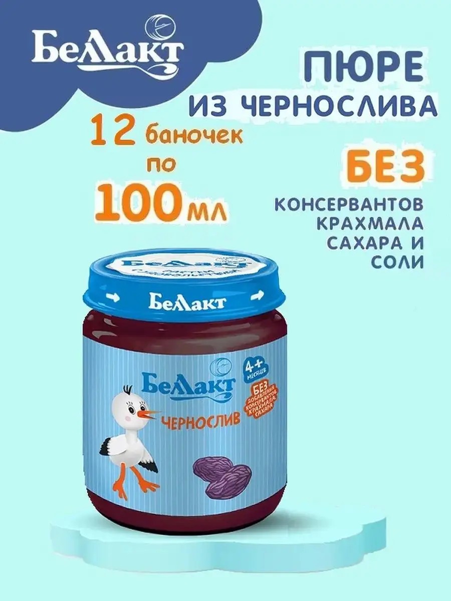Детские пюре фруктовые представлены различными группами без добавления крахмала, сахара, соли, консервантов и других пищевых добавок. Фруктовые пюре Беллакт приготовлены только из 100% фруктов, богатых витаминно-минеральным комплексом. Это вкусное а главное полезное пюре, которое полезно детям любого возраста! Фруктовое пюре обеспечивает организм ребенка пищевыми волокнами, разнообразными углеводами и минеральными веществами. Пюре из чернаслива рекомендуется детям с 4 месяцев, начиная с 0,5 чайной ложки в день, увеличивая к году до 100г в день. До вскрытия банки хранить при температуре от - до 25 градусов Цельсия и относительной влажности воздуха не более 75%. После вскрытия банки хранить при температуре от 0 до 6 градусов Цельсия не более суток. Вскрывать непосредственно перед употреблением. При отсутствии хлопка в момент вскрытия в пищу не употреблять. Перед употреблением взбалтывать!
