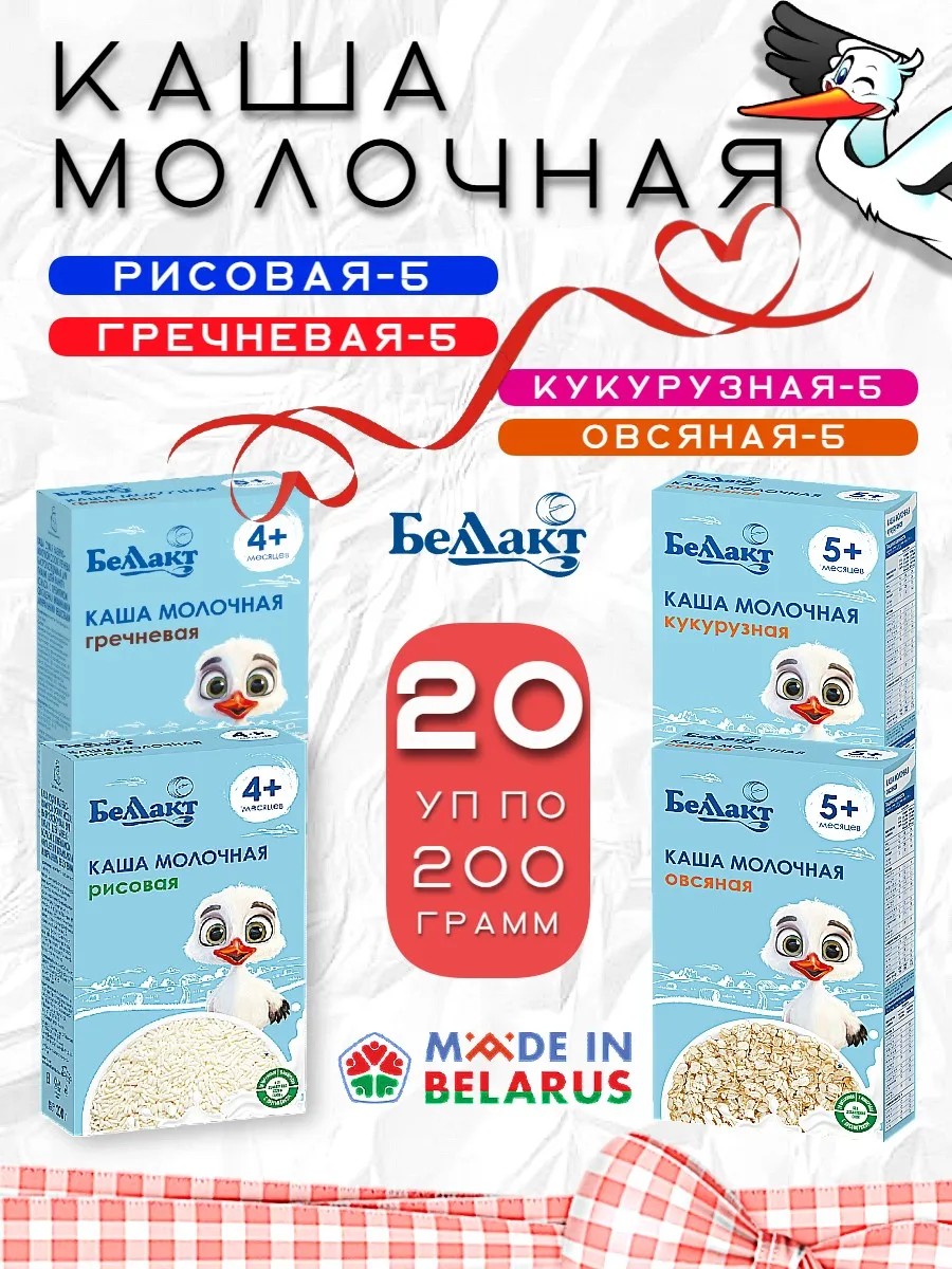 | Комплектация | 5 упаковок молочной каши гречневой по 200 грамм; 5 упаковок молочной каши рисовой по 200 грамм; 5 упаковок молочной каши овсяной по 200 грамм; 5 упаковок молочной каши кукурузной по 200 грамм |