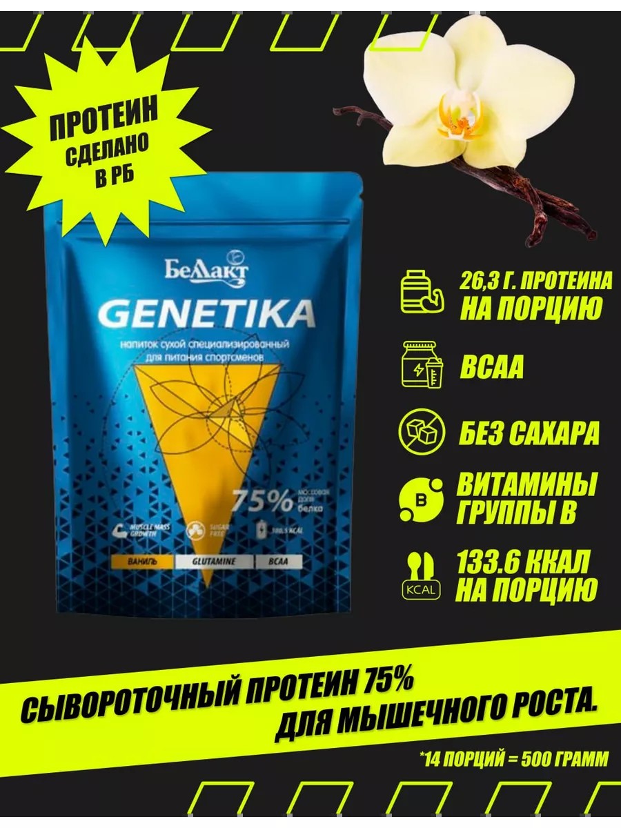 Купить протеин без сахара сывороточный 75 % смесь для молочного коктейля Genetika со вкусом ванили, рекомендуется в дополнение к основному рациону в качестве источника белка, энергии, пантотеновой и фолиевой кислот). – это сухая протеиновая пищевая молочная сыворотка представляющая собой однокомпонентный продукт для фитнеса и спорта. А так же для людей со сложностями проглатывания питание через зонт и как питание для онкобольных людей, восполнить энергию и белок в организме. Один пакет 500 грамм это 1700 мл готового коктейля с энергетической ценностью 380,5 ккал. За счет быстрого впитывания в кровоток препятствует развитию катаболических процессов в послетренировочный период. Эта сбалансированная добавка подходит как для профессиональных спортсменов, так и для людей ведущих активный образ жизни. Спортпит подходит для мужчин и женщин. Профессиональное питание с содержанием сывороточного белка помогает приросту мышечной массы. Ускоряет востановление после тренировок и предупреждает катаболизм мышц. Протеин сывороточный способствует укреплению защитных сил организма. Протеиновый десерт без сахара специализированный для питания спортсменов добавьте в свой ежедневный рацион он дополнит питание белком, углеводами, калориями. Это сбалансированный и питательный комплекс подходит в качестве перекуса или замены одного приема пищи. Протеин белорусский богатый аминокислотный состав, который значительно увеличивает показатели силы и выносливости. Пищевая смесь повышает продуктивность тренировочного процесса, улучшает качество набранной мускулатуры, рельефность и упругость мышечных волокон.