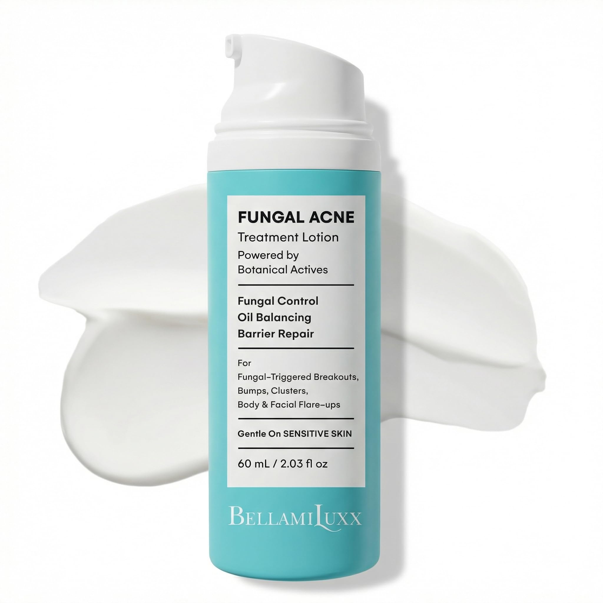 Brand Commitment: BellamiLuxx — Expert, Gentle Care for Acne-Prone Skin. Thoughtfully formulated for sensitive, acne-prone, and bumpy areas using effective botanicals and skin-compatible actives. Backed by attentive customer support and a satisfaction-focused service experience, we're here to help you feel confident and comfortable in your skin. Gentle, Safe Effective – Fragrance-free, paraben-free, heavy oil-free. Suitable for sensitive skin and daily use. Ideal as an acne treatment or acne moisturizer for teens and adults alike. Soothing Botanical Blend – Enriched with Aloe, Calendula, Birch Sap Kava Extract, this lotion calms irritation, eases discomfort, and hydrates without clogging pores. A natural alternative to harsh blemish spot treatment creams. Powered by Science Nature – With Piroctone Olamine to keep fungal-prone skin in check, Zinc PCA to balance excess oil, and Niacinamide to strengthen the barrier. A smart choice for those seeking a gentle pimple cream that doubles as a spot treatment for face. Face Body Care in One – Lightweight, non-greasy acne moisturizer for face and body. Absorbs quickly and is perfect for forehead, chest, back, and shoulders where fungal acne breakouts often appear. Especially suitable for oily skin, teens, men, and active lifestyles such as gym-goers and athletes. Made for Fungal-Prone Skin – This fungal acne treatment lotion is specifically designed for bumps, clusters, redness, and itch linked to Malassezia yeast. Works as an effective acne treatment for face and body, supporting clearer, balanced skin.