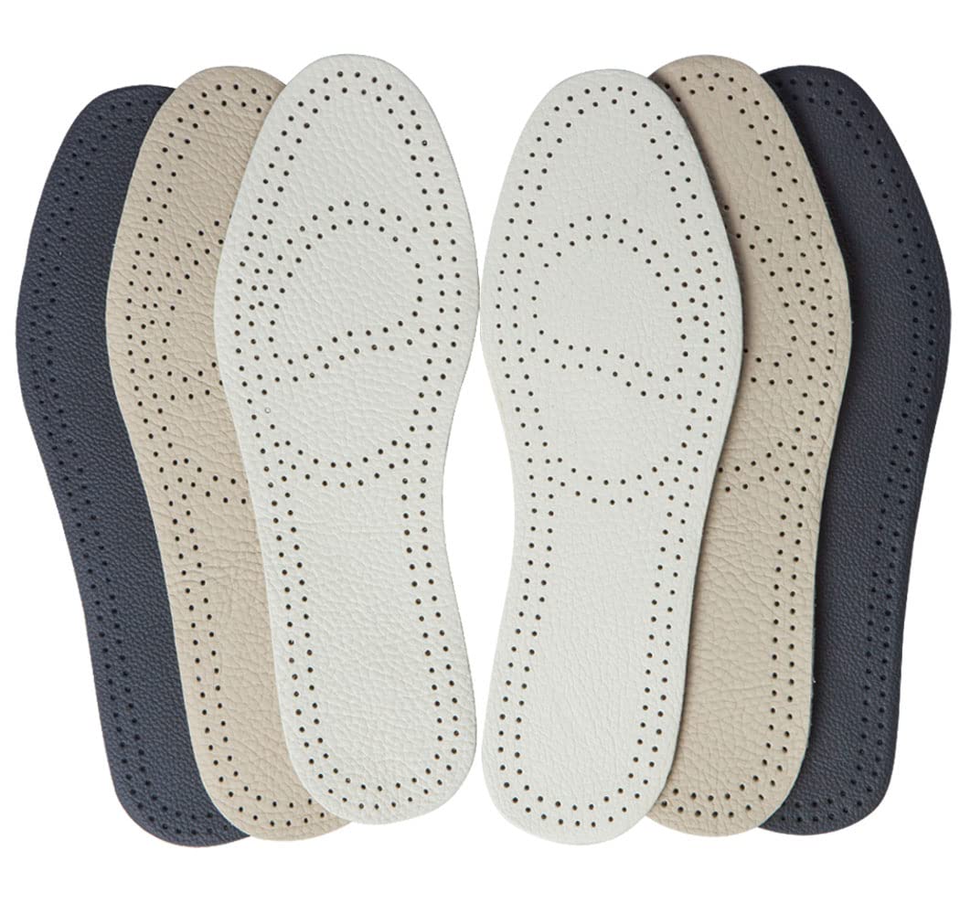 Bellcon leather insoles are great for the normal feet and flat feet, provide your feet very comfortable cushion, allows your feet to breathe freely in the shoes. Both the top leather and bottom activated carbon latex help to absorb the humidity and sweat, always keep your feet fresh, dry and non smell. The effective activated carbon latex also help to absorb stress and shocks, eater odors, and non-skid in the shoes. Bellcon leather insoles fit for most shoes for men and women, and it would be better to measure your feet size from the toe to heel, then order them according to the size chart on the picture. If you are not satisfied with Bellcon leather insoles, please kindly contact us, we are willing to offer you a free exchange or 100% money back! Bellcon Leather insole size: EU 36 = US Women 6-6.5 EU 37= US Women 7-7.5 EU 38 = US Women 8-8.5 EU 39 = US Women 9-9.5 / Men 6-6.5 EU 40 = US Women 10-10.5/ Men 7-7.5 EU 41 = US Women 11-11.5 / Men 8-8.5 EU 42 = US Men 9-9.5 EU 43 = US Men 10 EU 44 = US Men 10.5 EU 45= US Men 11 EU 46 = US Men 11.5 Package includes: 1 pair of black leather insoles 1 pair of white leather insoles 1 pair of Gray leather insoles Warmly tips: 1. Color problems: the photos color may occur a little different from the real insoles, because different display screen may come into a little chromatism. 2. The insole size is measured manually, thus there is little error (Error: 1-2cm). If they are big, please trim them along with the edge. If they are small, please contact us for free exchange. 3. Please do not wash them. If they are dirty, please take them out and wipe them with damp rag. Then put them in a cool ventilated place dry. 4.Replace them every 3 months for your healthy feet.Quality Guarantee 12 Months: Bellcon guaranteed our genuine leather insoles lasting for 12 months for men and women, are great for the normal arch and flat feet, who are often walking, hiking and long time standing workers. Podiatrist suggest: keep your feet healthy, please replace your old shoe pads every 3 months. Give you a comfort and fresh day. Perfect Fit for Most Shoes: Bellcon 3 pack leather insoles with 11 different sizes, available from US women 6 to 12, US men 6-11.5; Each pack includes 3 pairs leather insoles with 3 different colors (black + gray + white). Easily trim by the edge of holes, just compare to your old shoe pads, draws the cutting guide lines then cut them. Fit for most shoes, such as dress shoes, causal shoes, sneakers, high heels, sandals, slippers, loafters, athletic shoes, cowboy boots etc. Sweat and Moisture Wicking, Breathable and Lightweight: The leather cover and latex bottom are designed with the perforated holes to breath. Not only the top of the leather can absorb the moisture and sweat, but also the latex featured with lots of holes in itself, which makes your feet fresh and dry all day long. The flat profile design are great for any shoes and don’t take up too much spaces! Feel very comfortable and lightweight like walking on the new shoes. Non-slip, Shock Absorbing, and Odor Control: Bellcon genuine leather insoles are constructed with the thick activated carbon latex bottom, which provide the comfortable cushioning for every part of feet, absorb shocks and stresses of each step while standing, waking, running and exercising. The carbon latex help to control the feet smell and increase the friction in shoes, keep shoe insoles staying in place after a whole day. 100% Premium Genuine Leather: Bellcon 3 pack leather insoles are made of the premium cowhide leather cover and nature activated carbon latex bottom, the exquisite grain cover is very soft and skin friendly to touch for your delicate feet, and the bottom latex provide comfortable cushioning and moisture and sweat wicking, shocks absorbing, lightweight and long lasting to wear.