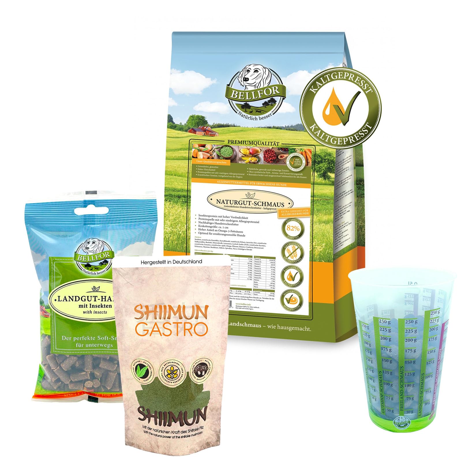 Food kit for large dogs suffering from digestive disorders. Digestive disorders such as bloating, heartburn or diarrhea are extremely unpleasant for dogs and significantly limit the quality of life of four-legged friends. Our economical kit is suitable for large dogs suffering from the following health and behavioral problems: bloating. vomiting. diarrhea. heartburn. Loss of appetite. Eating feces. Eating too much weed. Gastritis. pancreatitis. Our dry food for large dogs with sensitive digestion. For dogs with digestive issues, a premium dog food with digestive ingredients is especially important. Our Naturgut foam is ideal for large dogs in this case. Bellfor Landgut-Happen are our grain-free insect-based dog treats. Digestive treats are ideal for giving your dog a little reward despite digestive problems. Shiimun Gastro promotes healthy digestion. With a natural dietary supplement like Shiimun Gastro, you can help combat existing digestive disorders in your dog. Naturgut-Schmaus (indication of feeding per day: dogs up to 1-5 kg - 30-100 g, up to 5-10 kg - 100-180 g, up to 10-20 kg - 180-300 g, up to 20-40 kg - 300-510 g, up to 40-60 kg - 510-735 g). gut-Happen (Bellfor Landgut-Happen ideal for training dogs at school or at home) Shiimun Gastro ( INGREDIENTS Naturgut Schmaus (insects, fresh potato harvest, potato flour, fresh peas, animal fat, fresh sweet potatoes, brewer's yeast, minerals, flaxseed, salmon oil, inulin (FOS), fresh harvested carrots, fresh tomatoes, mango, plum, banana, cranberry, nettle, echinacea, thyme, thyme. Mian, basil Celery, spirulina, extract yucca-Schidigera) Landgut-Happen (black soldier fly (45 ), potato, plant. glycerin, linseed oil, carrot, apple, flaxseed, cranberry) Shiimun Gastro (20 shiitake (ground), 15 yarrow (ground), 15 anise (ground), 15 lemon balm (cut), 10 sage (cut), 10 watercress (cut), 10 turmeric (jelly grind), 5 chamomile (ground) DIRECTIONS FOR USE Detailed feeding information based on weight and age can be found on the back of the package and in the Marsapet Shiimun Gastro powder food supplement for dogs contains yarrow (15 ), which has an antispasmodic effect and can be used in cases of digestive problems. Nutrient-rich Shiitake mushrooms (20 ) can help your dog and cat, for example, with heartburn, bloating, diarrhea, and constipation. Bellfor Landgut treats are 100 grain-free and contain at least 26 insect protein. The ingredients come from certified raw material suppliers and are sourced locally. In our Bellfor Naturgut-Schmaus dog food - Cold-pressed - insect protein (82 ) with high digestibility. Bellfor Naturgut-Schmaus Cold-pressed dry food with insects Grain-free Protein source with very low allergen potential. Kit de nourriture pour grands chiens souffrant de troubles digestifs. Les troubles digestifs tels que les ballonnements, les brûlures d'estomac ou la diarrhée sont extrêmement désagréables pour les chiens et limitent considérablement la qualité de vie des amis à quatre pattes. Notre kit économique est adapté pour les grands chiens souffrant de problèmes de santé et de comportement suivants : ballonnements. vomissements. diarrhée. brûlures d'estomac. Perte d'appétit. Manger des excréments. Manger trop d'herbe. Gastrite. pancréatite. Notre nourriture sèche pour grands chiens à digestion sensible. Pour les chiens souffrant de problèmes digestifs, une nourriture pour chien de qualité supérieure avec des ingrédients digestifs est particulièrement importante. Notre mousse Naturgut est idéale pour les grands chiens dans ce cas. Bellfor Landgut-Happen sont nos friandises pour chien sans céréales à base d'insectes. Les friandises digestives sont idéales pour donner à votre chien une petite récompense malgré les troubles digestifs. Shiimun Gastro favorise une digestion saine. Avec un complément alimentaire naturel comme Shiimun Gastro, vous pouvez aider à lutter contre les troubles digestifs existants chez votre chien. Naturgut-Schmaus (indication d'alimentation par jour : chiens jusqu'à 1-5 kg - 30-100 g, jusqu'à 5-10 kg - 100-180 g, jusqu'à 10-20 kg - 180-300 g, jusqu'à 20-40 kg - 300-510 g, jusqu'à 40-60 kg - 510-735 g). gut-Happen (Bellfor Landgut-Happen idéal pour l'entraînement des chiens à l'école ou à la maison) Shiimun Gastro ( INGRÉDIENTS Naturgut Schmaus (insectes, récolte de pommes de terre fraîches, farine de pommes de terre, pois frais, graisse animale, patates douces fraîches, levure de bière, minéraux, graines de lin, huile de saumon, inuline (FOS), carottes fraîches récoltées, tomates fraîches, mangue, prune, banane, canneberge, ortie, échinacée, thyyacée, thyyacée. Mian, basilique Céleri, spiruline, extrait de yucca-Schidigera) Landgut-Happen (mouche noire du soldat (45 ), pomme de terre, plante. glycérine, huile de lin, carotte, pomme, graines de lin, canneberge) Shiimun Gastro (20 shiitake (moulu), 15 achillée millefeuille (moulue), 15 anis (moulu), 15 de mélisse (coupée), 10 de sauge (coupée), 10 de cresson (coupée), 10 . Curcuma (gelée moudre), 5 de camomille (moulue) MODE D'EMPLOI Vous trouverez des informations détaillées sur l'alimentation en fonction du poids et de l'âge au dos de l'emballage et dans la Le complément alimentaire Marsapet Shiimun Gastro en poudre pour chiens contient de l'achillée millefeuille (15 ) qui a un effet antispasmodique et peut être utilisé en cas de problèmes digestifs. Les champignons Shiitake riches en nutriments (20 ) peuvent aider votre chien et chat par exemple en cas de brûlures d'estomac, de ballonnements, de diarrhée et de constipation. Les friandises Bellfor Landgut sont 100 sans céréales et contiennent au moins 26 de protéines d'insectes. Les ingrédients proviennent de fournisseurs de matières premières certifiés et proviennent de la région. Dans notre nourriture pour chien Bellfor Naturgut-Schmaus - Pressée à froid - Protéines d'insectes (82 ) à haute digestibilité. Bellfor Naturgu