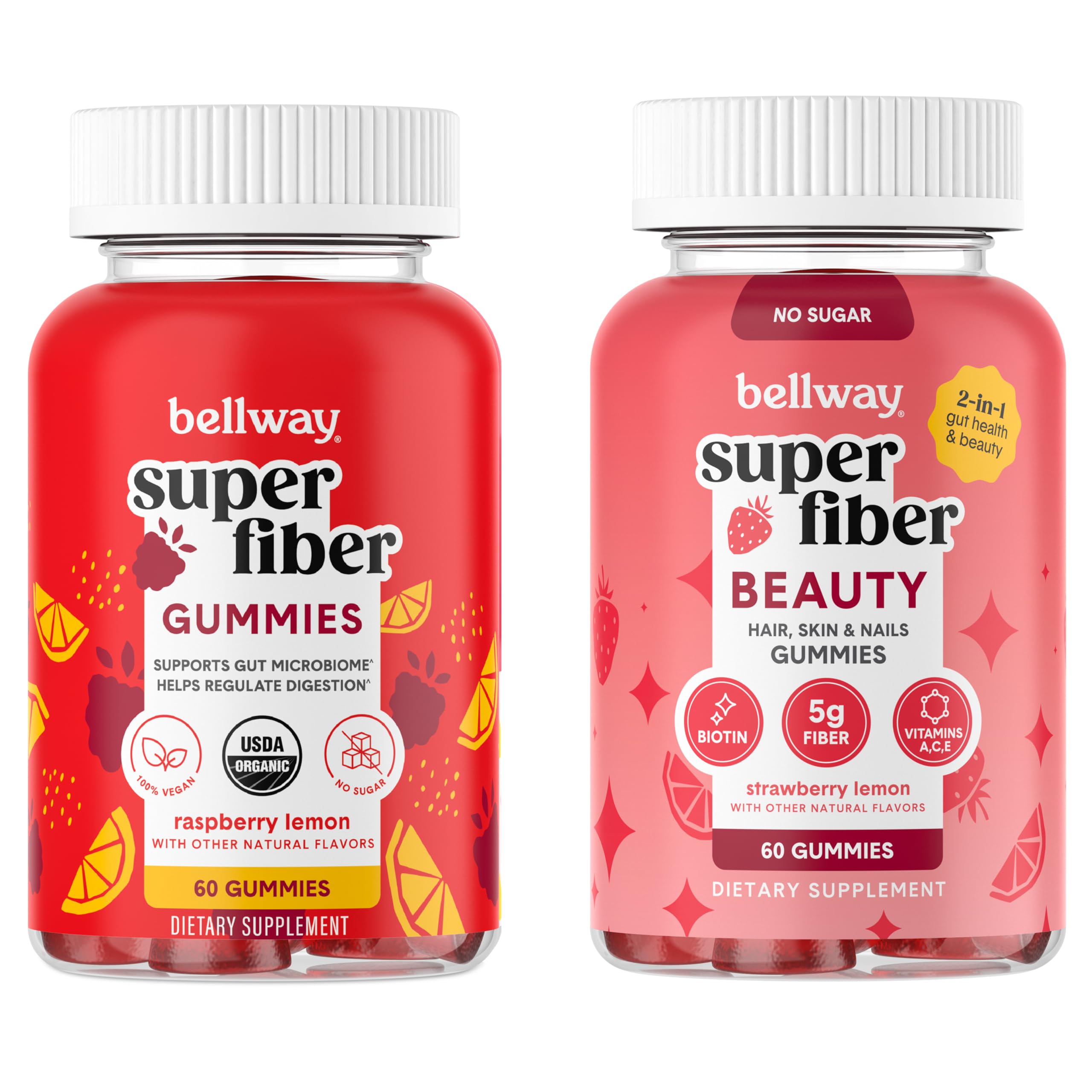 The Bellway Super Fiber Gummies Beauty Gummies Bundle makes supporting your gut and beauty simple and delicious. Super Fiber Gummies deliver 4g of organic prebiotic fiber per serving to promote regularity, digestive health, and immune function. Beauty Gummies provide fiber, biotin, and vitamins A, C, and E to enhance skin radiance, hair strength, and nail health. Super Fiber Gummies are USDA organic and made with real fruit and clean, plant-based ingredients. Beauty Gummies are vegan, gluten-free, sugar-free, and free from artificial colors or flavors. Enjoy a simple, tasty daily routine that supports gut health, nutrient absorption, and natural beauty all in one bundle.Simple Daily Routine: Take a few gummies anytime to support digestion, nutrient absorption, and natural beauty in a tasty, convenient way every day. Clean Ingredients: Made with real fruit and organic chicory root fiber, Super Fiber Gummies are USDA organic, non-GMO, and free from artificial colors or flavors. Beauty Gummies are vegan, gluten-free, sugar-free, and perfect on-the-go. Boost Your Beauty from Within: Fiber and prebiotics in Super Fiber Gummies support a balanced gut, complementing Beauty Gummies' vitamins and biotin to strengthen hair, skin, and nails. Support Digestive Wellness: Super Fiber Gummies nourish your gut microbiome with prebiotic fiber to promote regularity and comfort, while Beauty Gummies help your body absorb nutrients for a healthier glow. Glow Inside and Out: Super Fiber Gummies support digestion, gut health, and immunity, while Beauty Gummies provide biotin and essential vitamins for radiant skin, hair, and nails.
