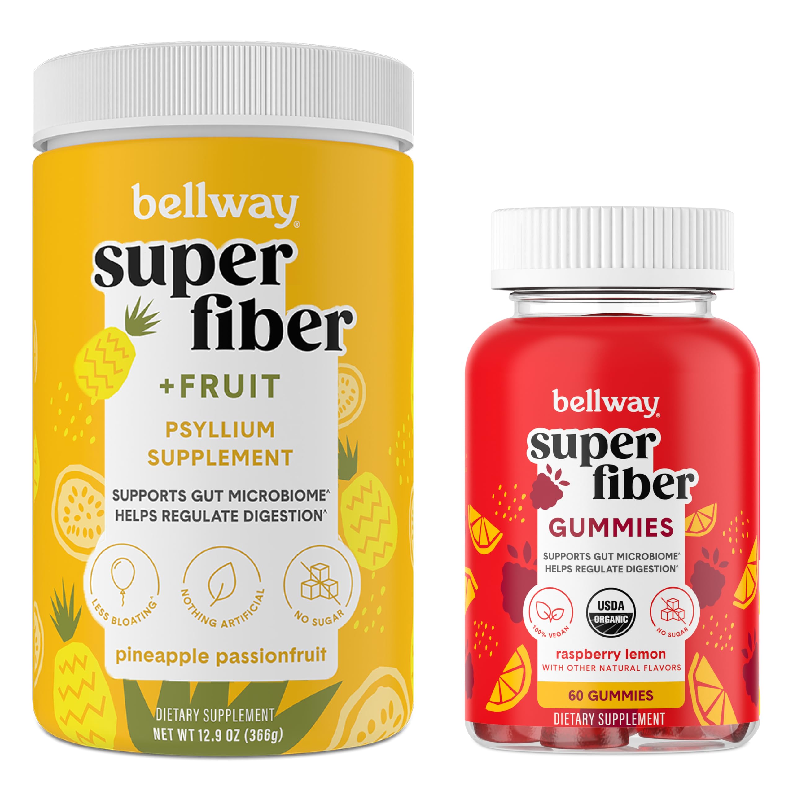 Not Your Grandma's Fiber: A trusted source of next-generation dietary fiber supplements, Bellway has created a gentle fiber choice packed with prebiotics for gut health you can feel good about!. Fast Results: these dietary fiber supplements will help you achieve healthy, regular results in as little as 2 days. Feel Lighter and More Regular: Say so long to that heavy feeling in your gut Our daily fiber supplements safely and effectively help reduce constipation, bloating, diarrhea, and more. Blended in the USA: Bellway Super Fiber Fruit is plant-based, made with organic psyllium husk and contains both soluble and insoluble fiber. Bellway Super Fiber Gummies are made with organic chicory root fiber, they are USDA organic, non-GMO, gluten-free, aspartame-free, kosher, lab-tested, and free of artificial ingredients. Super Fiber Fruit Gummies Bundle: Bellway Super Fiber Fruit provides 5g of psyllium husk fiber, supporting gut health, regularity, and immune function. The Super Fiber Gummies offer a convenient and tasty on-the-go solution to incorporate fiber into your daily diet with 4g of Fiber Per Serving.