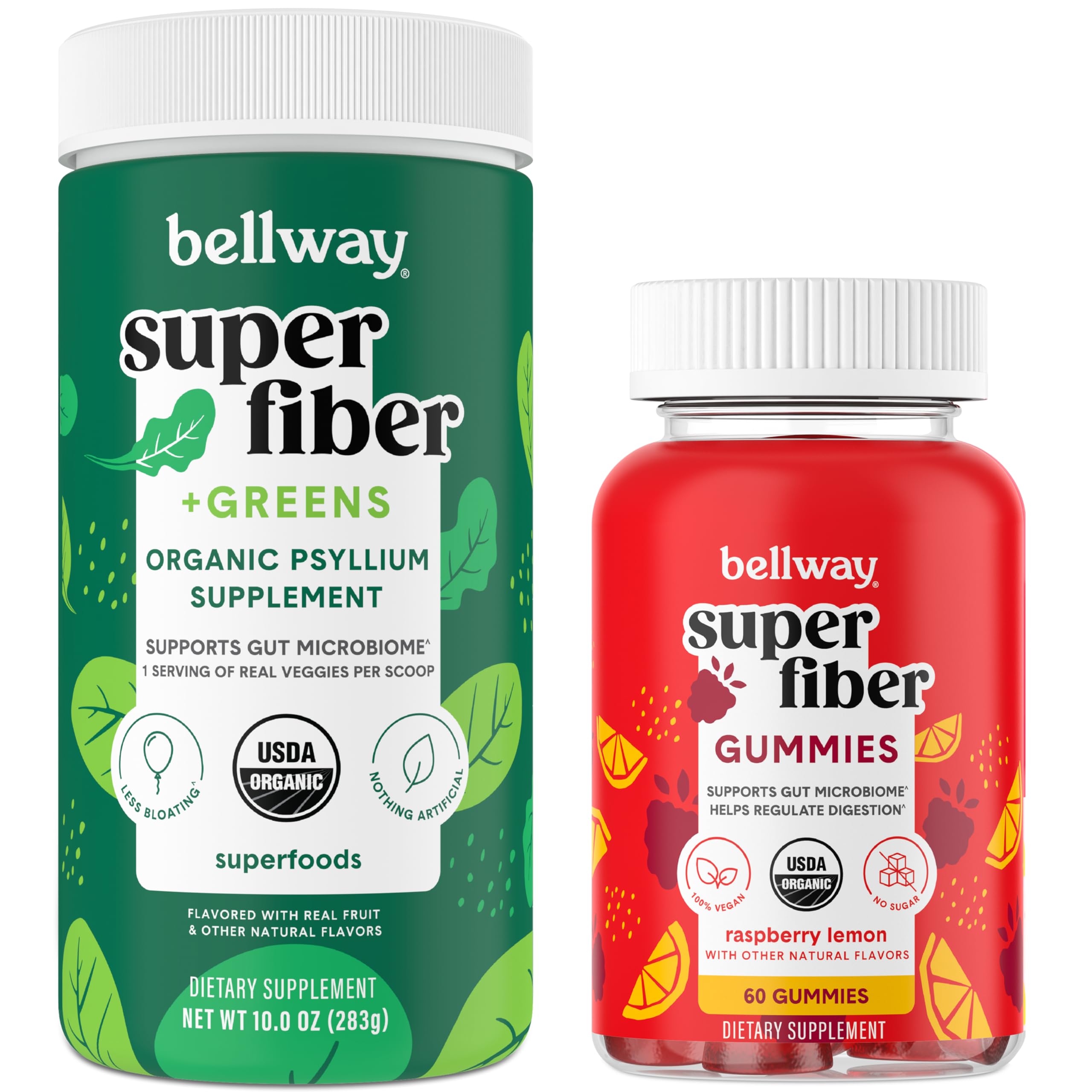 Bellway's Super Fiber Greens Capsules Bundle is your ultimate solution for optimal gut health, regularity, immune support and overall well-being. Packed with 1 serving of real veggies 5 grams of psyllium husk fiber, Bellway Super Fiber Greens ensures that you get the fiber your body needs. The inclusion of psyllium husk fiber in your daily routine promotes digestive wellness, helps maintain regularity, and supports your immune system. For those on the move, Bellway Super Fiber Gummies offer a convenient, delicious, and easy way to incorporate fiber into your diet whenever and wherever. These fiber gummies provide a seamless solution to boost your fiber intake, ensuring that you stay on track with your health goals even during the busiest of days. Upgrade your daily fiber intake with Bellway's Super Fiber Greens Gummies Bundle – the perfect combination to support your overall well-being.Not Your Grandma's Fiber: A trusted source of next-generation dietary fiber supplements, Bellway has created a gentle fiber choice packed with prebiotics for gut health you can feel good about!. Fast Results: These dietary fiber supplements will help you achieve healthy, regular results in as little as 2 days. Feel Lighter More Regular: Say goodbye to that heavy feeling in your gut. Safely and effectively support digestive comfort, ease occasional constipation, gas, and bloating. USDA Organic: Bellway Super Fiber Greens is plant-based, made with organic psyllium husk and greens powder, it contains both soluble and insoluble fiber. Bellway Super Fiber Gummies are made with organic chicory root fiber, they are USDA organic, non-GMO, gluten-free, aspartame-free, kosher, lab-tested, and free of artificial ingredients. Super Fiber Greens Gummies Bundle: One scoop of Bellway Super Fiber Greens provides 1 serving of real veggies 5 grams of fiber, supporting gut health, regularity, immune function and overall well-being. The Super Fiber Gummies offer a convenient and tasty on-the-go solution to incorporate fiber into your daily diet with 4g of fiber per serving.