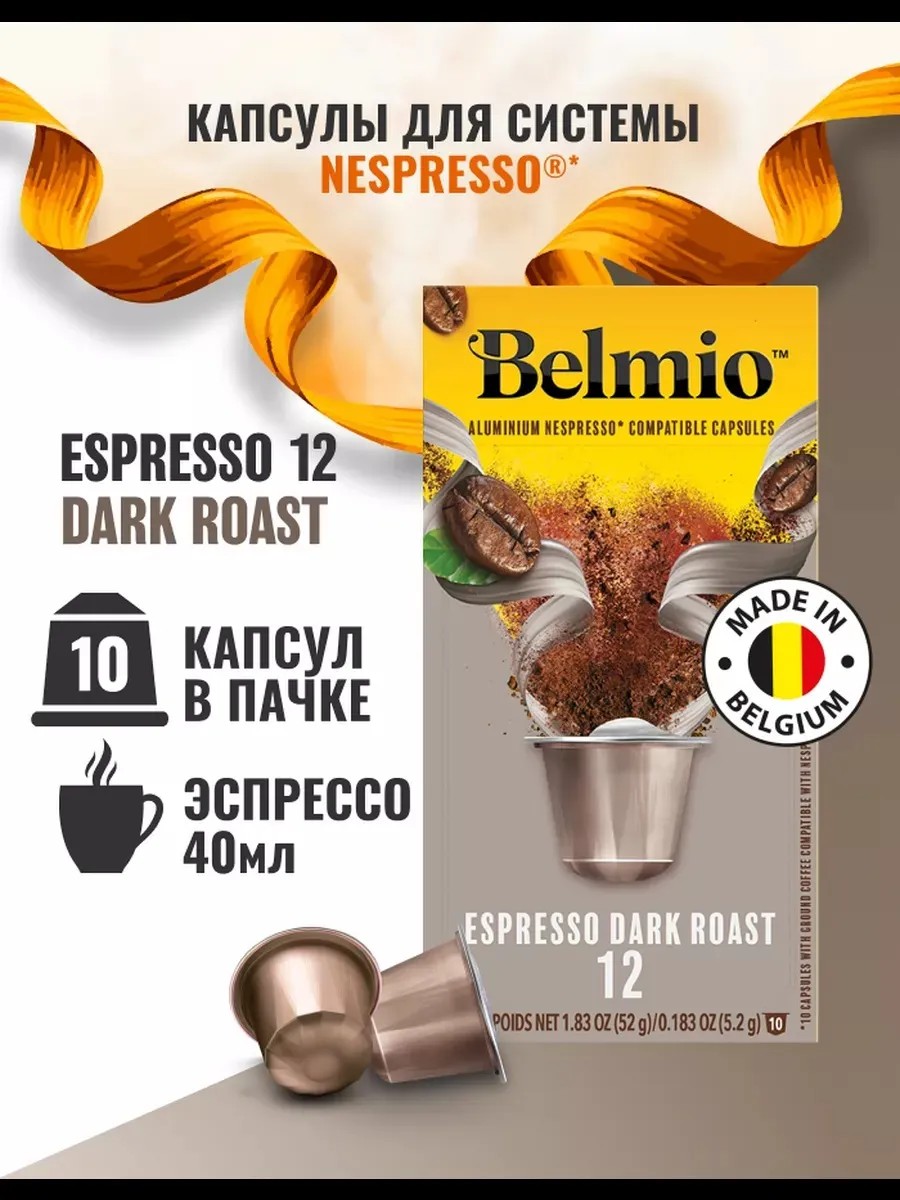Кофе Belmio Espresso Dark Roast (intensity 12) представлен в капсулах из экологически безопасного алюминия, который сохраняет аромат молотых зерен. Темная обжарка способствует получению яркого, крепкого и насыщенного вкуса. При приготовлении напитка сверху образуется мягкая кофейная пенка. Страна производства — Бельгия. В составе присутствует 60% «Арабики» и 40% «Робусты». Набор состоит из 10 капсул, совместимых с кофемашинами Nespresso. Объем готового напитка равен 25 мл.