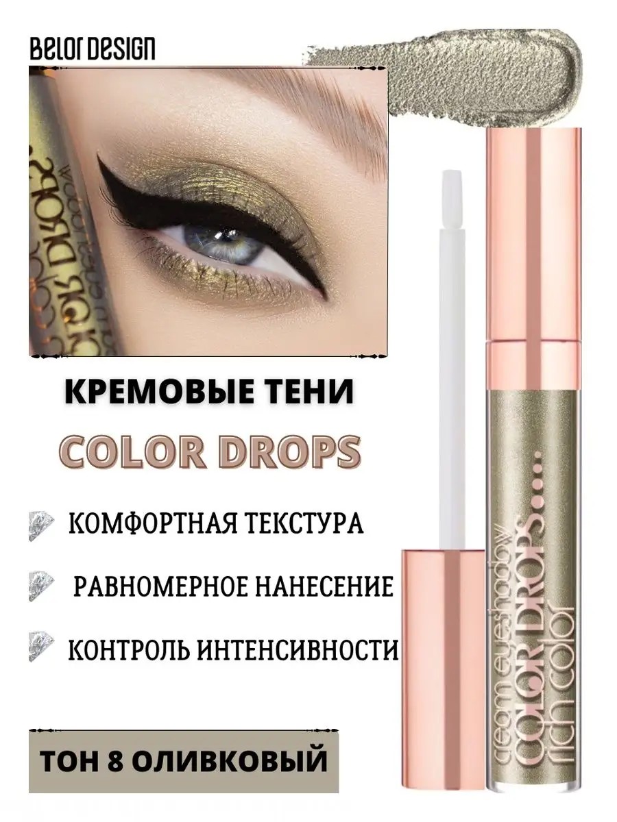 COLOR DROPS cream eyeshadows from the Belarusian decorative cosmetics brand Belor Design. These liquid eyeshadows allow you to create makeup looks of varying complexity in a single application, either as a base or as a base for dry shades! The comfortable, easy-to-glide fluid texture of these pearlescent eyeshadows, combined with an easy-to-use applicator that easily controls the intensity, will create a subtle, subtle sparkle or a bold, reflective shimmer reminiscent of liquid metal. Aloe vera in the formula allows the delicate texture to glide smoothly onto the eyelids without tugging. The entire line of enchanting nude bases and vibrant shades will create exclusive color combinations, where light shades easily act as highlighters, while dark shades add depth to the eyes! These shimmery eyeshadows have long-lasting, easily blendable pigments, making them a favorite of both beginners and professional makeup artists. Directions for use: Shake the bottle before use. Using the applicator, apply the chosen shade of eyeshadow evenly to the eyelids with a light motion and blend well.