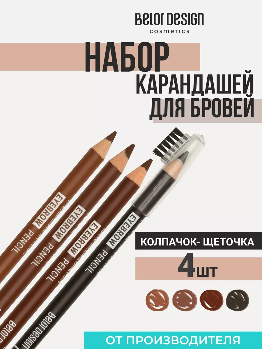 4 универсальных оттенка для безупречного макияжа. С карандашами от Белор Дизайн легко и удобно корректировать форму и цвет бровей, а маленькая щеточка поможет для нанесения карандаша и создания формы и растушевки. Текстура карандашей для бровей равномерно наносится, хорошо растушевывается. Естественные оттенки идеально выравнивают цвет бровей. Карандаши подходят и для прорисовки межреснички и для трендового макияжа губ. В наборе 4 штуки, Вы с легкостью подберете свой идеальный оттенок! Карандаши для бровей в 3 оттенках - темно-коричневый, коричневый, тауп,